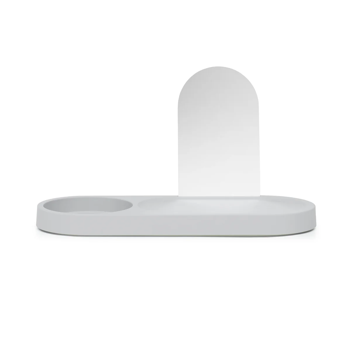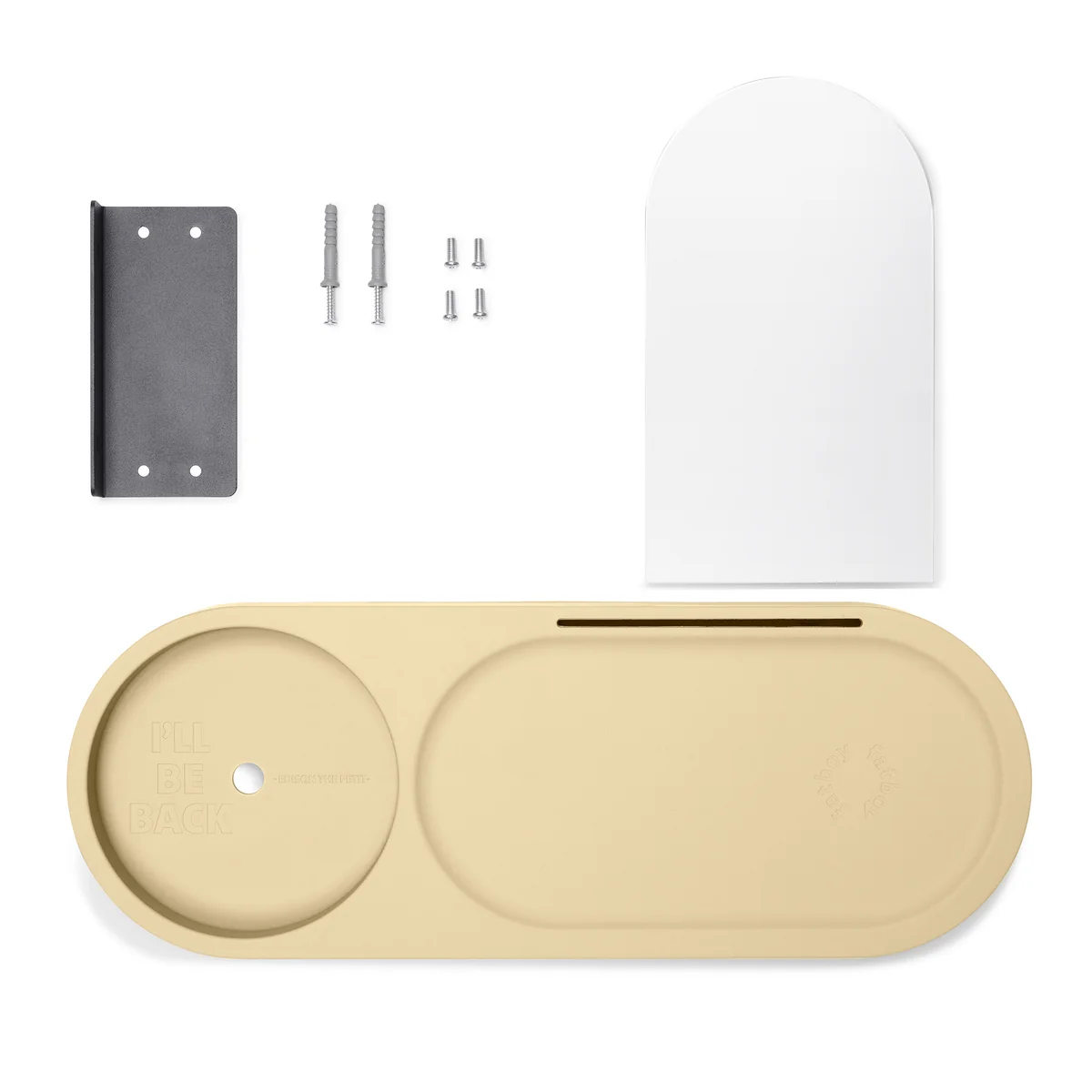 Die Tischleuchte wird mit einem Spiegel geliefert, der in den passenden Schlitz des Regals gesteckt werden kann. So ist immer alles optimal greifbar. Das Regal kann entweder nach Bedarf hingestellt oder mit der versteckten Halterung an der Wand befestigt werden.