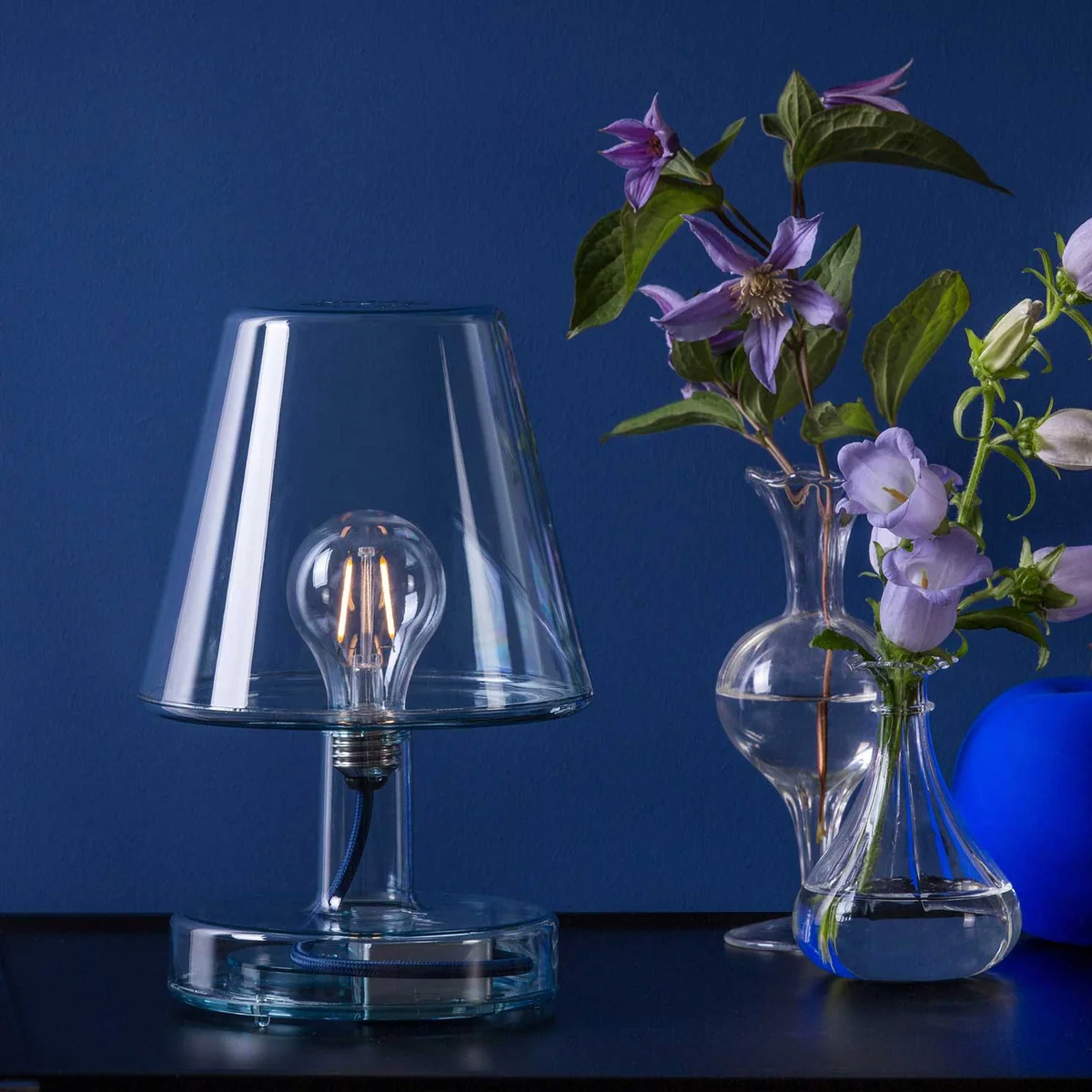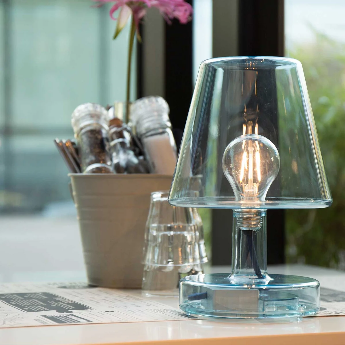 Im Gegensatz zur Edison The Petit gibt Transloetje den Blick auf sein Innenleben frei: Dabei präsentiert die tragbare Tischleuchte im Retro-Design dem Betrachter eine LED Lampe in Form einer traditionellen Glühbirne, die durch ein Kabel mit dem Akku in der Basis verbunden ist.