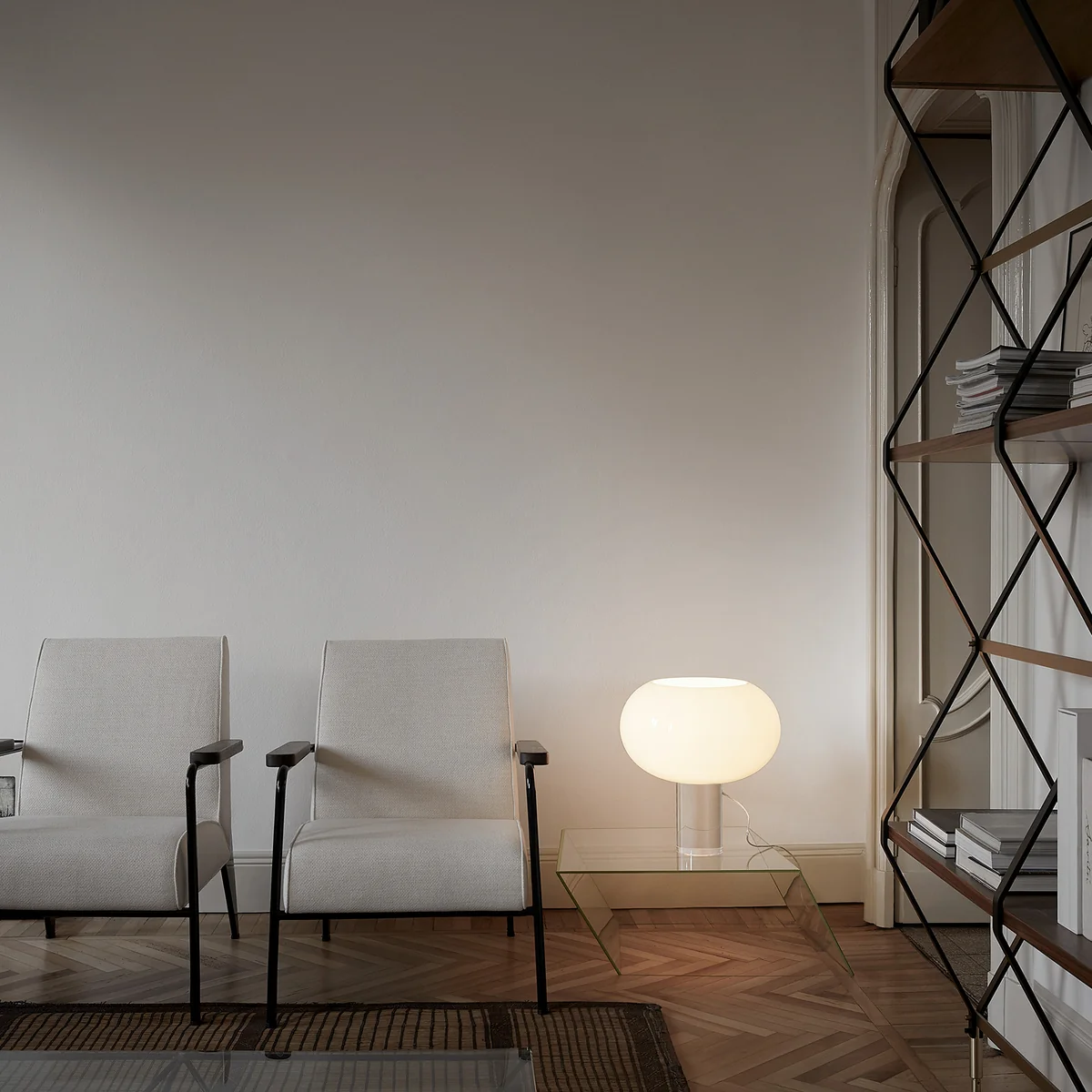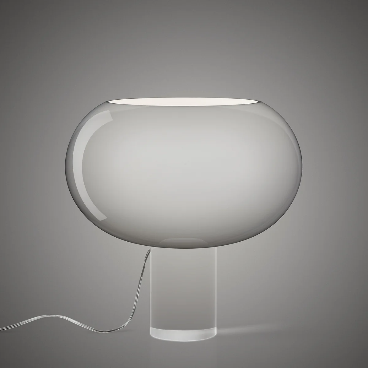 Der Diffusor ruht auf einem transparenten, zylinderförmigen Fuss aus Kunststoff, wodurch er nahezu schwerelos erscheint. Hierdurch entsteht eine Formsprache, die von Purismus sowie von Reinheit erzählt und der Leuchte ein edles Erscheinungsbild verleiht.