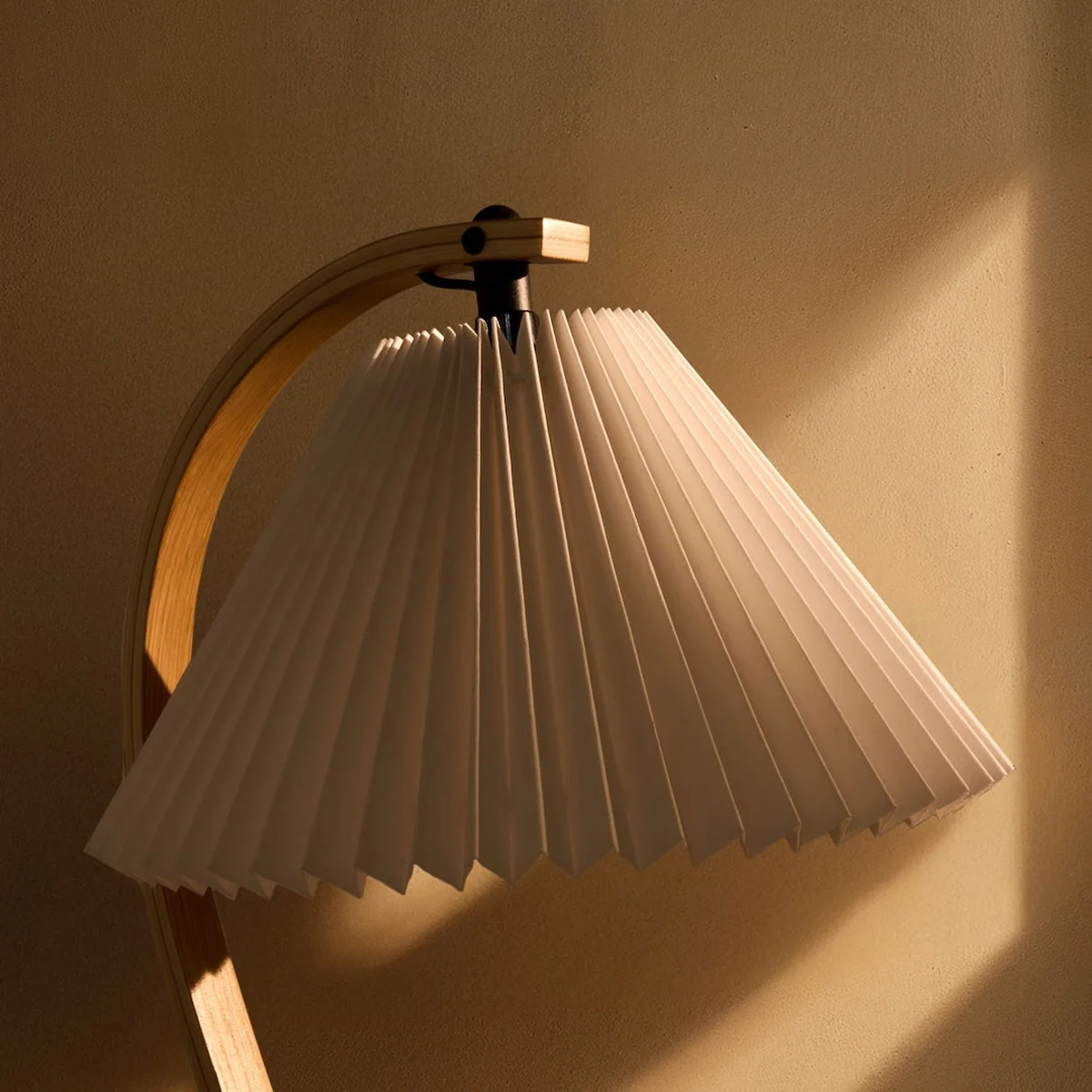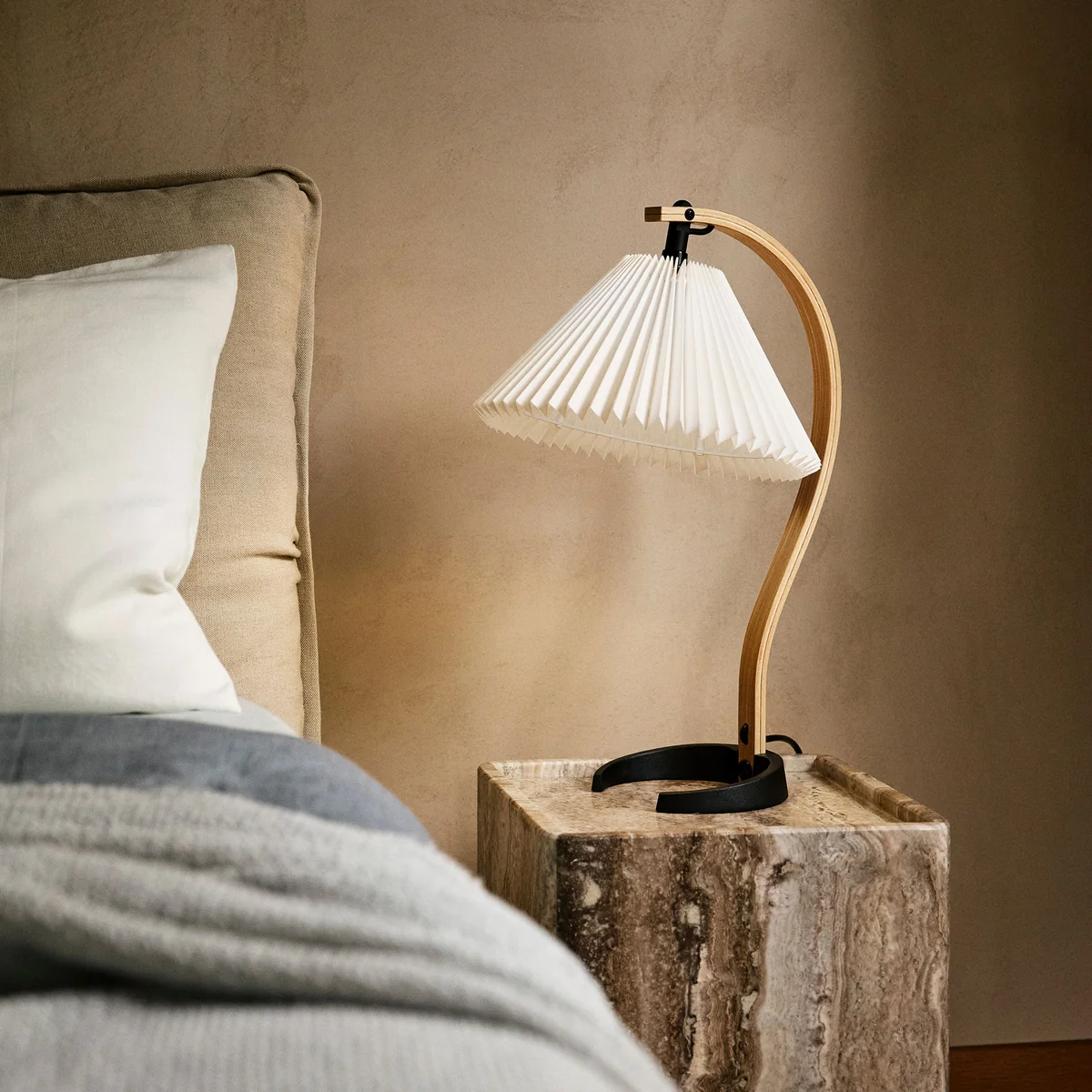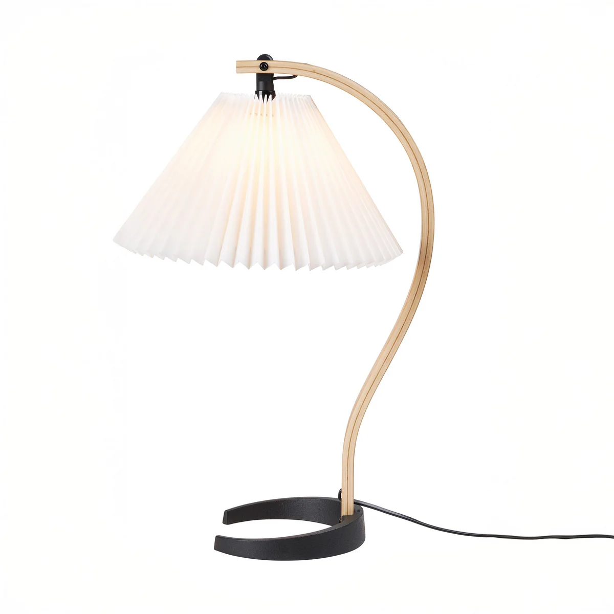 Die Timberline Tischleuchte bringt das beliebte Design der Mads Caprani Stehleuchte in einer schreibtischtauglichen Version. Getreu der ursprünglichen, von einem Fragezeichen inspirierten Form, behält dieses kompakte Modell die geschwungene Silhouette und den verspielten skandinavischen Stil der 1970er Jahre bei – mit dezenten Anpassungen für Stabilität und Funktionalität. Präzise gefertigt, besteht die Lampe aus einer gebogenen Holzstruktur aus neun Schichten Eiche und Birke, einem verstellbaren Schirm, der das Licht gezielt lenken lässt, sowie einem stabilen Gusseisen-Sockel in Halbmondform. Sie ist leicht umstellbar und schafft in jeder Umgebung eine warme, einladende Atmosphäre.