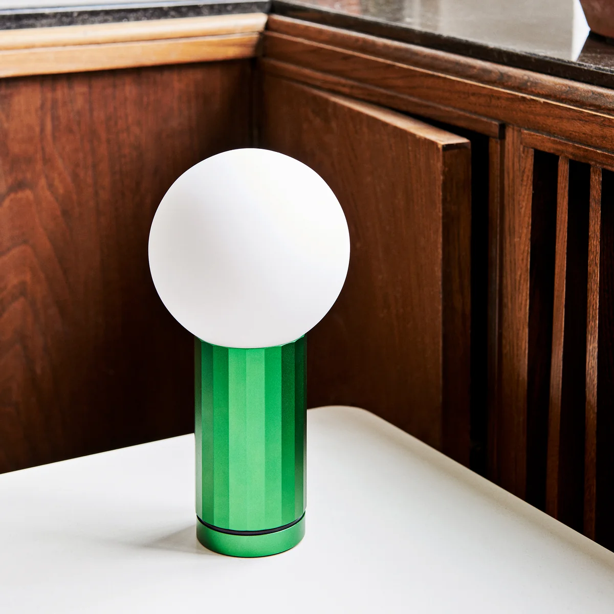 Die Turn On Tischleuchte von HAY macht ihrem Namen alle Ehre: Der Leuchtkörper aus Opalglas wird auf einer zylinderförmigen Aluminiumbasis gehalten, der gleichzeitig als ON/OFF Schalter dient.