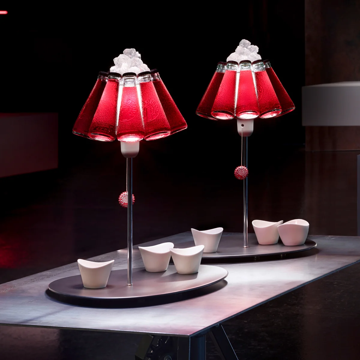 Der Fuss der Leuchte besteht aus Kunststoff, der Ständer aus Metall, die Eiswürfel aus Glas und der Schirm aus originalen, abnehmbaren und ersetzbaren Campari-Flaschen. Das Kabel ist transparent.