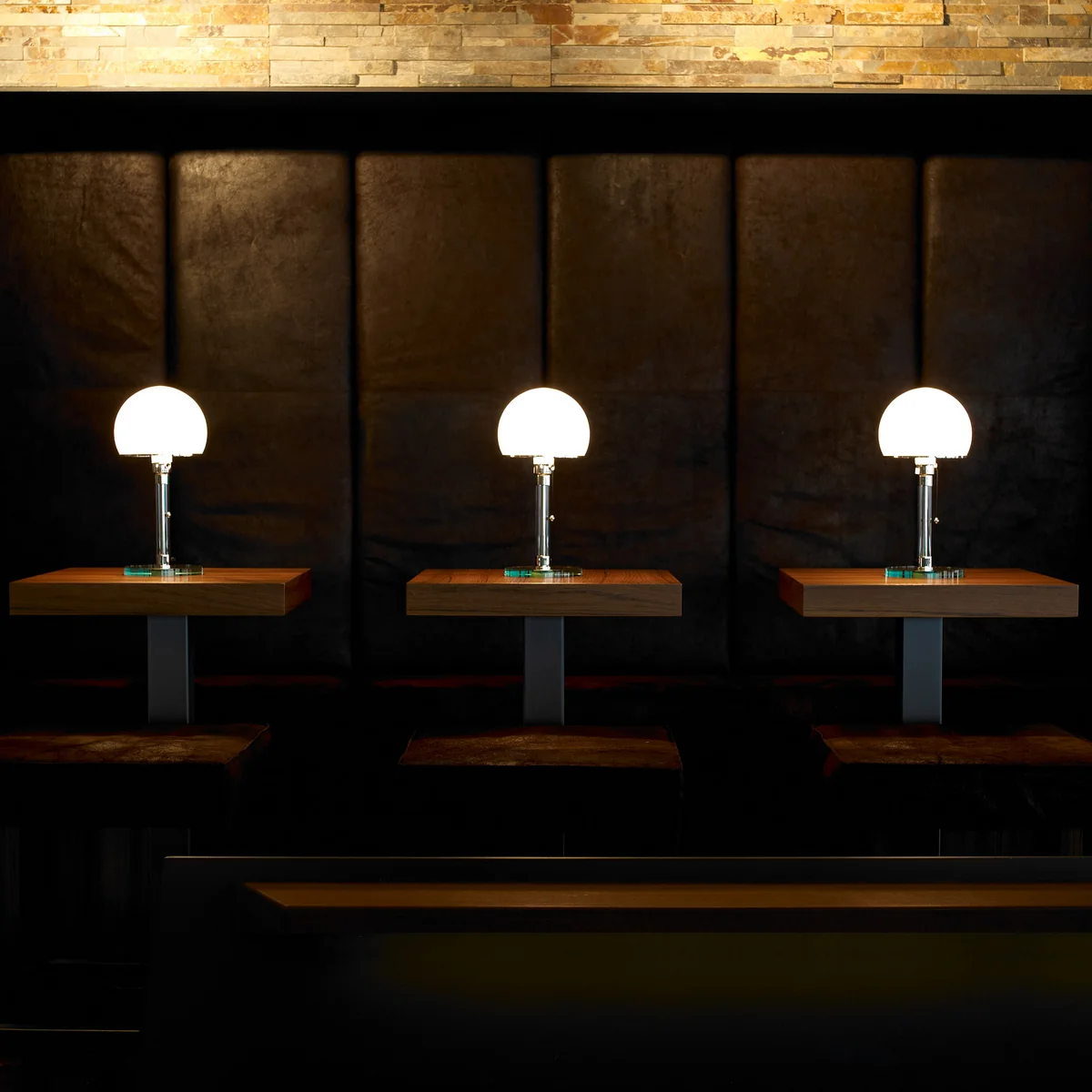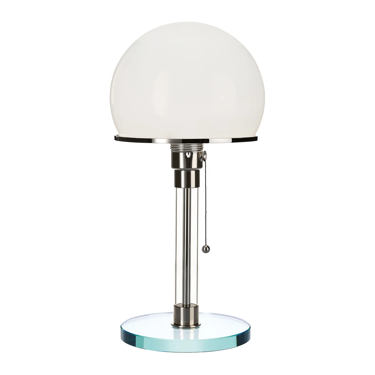 Die WG 24 Wagenfeld-Leuchte besteht aus einer opalfarbenen Glaskuppel, der Fuss und die Säule bestehen aus Klarglas und die Einfassungen aus vernickeltem Metall. Die metallenen Halbkugeln unter der Fussplatte geben der Leuchte ihre “Leichtfüssigkeit".