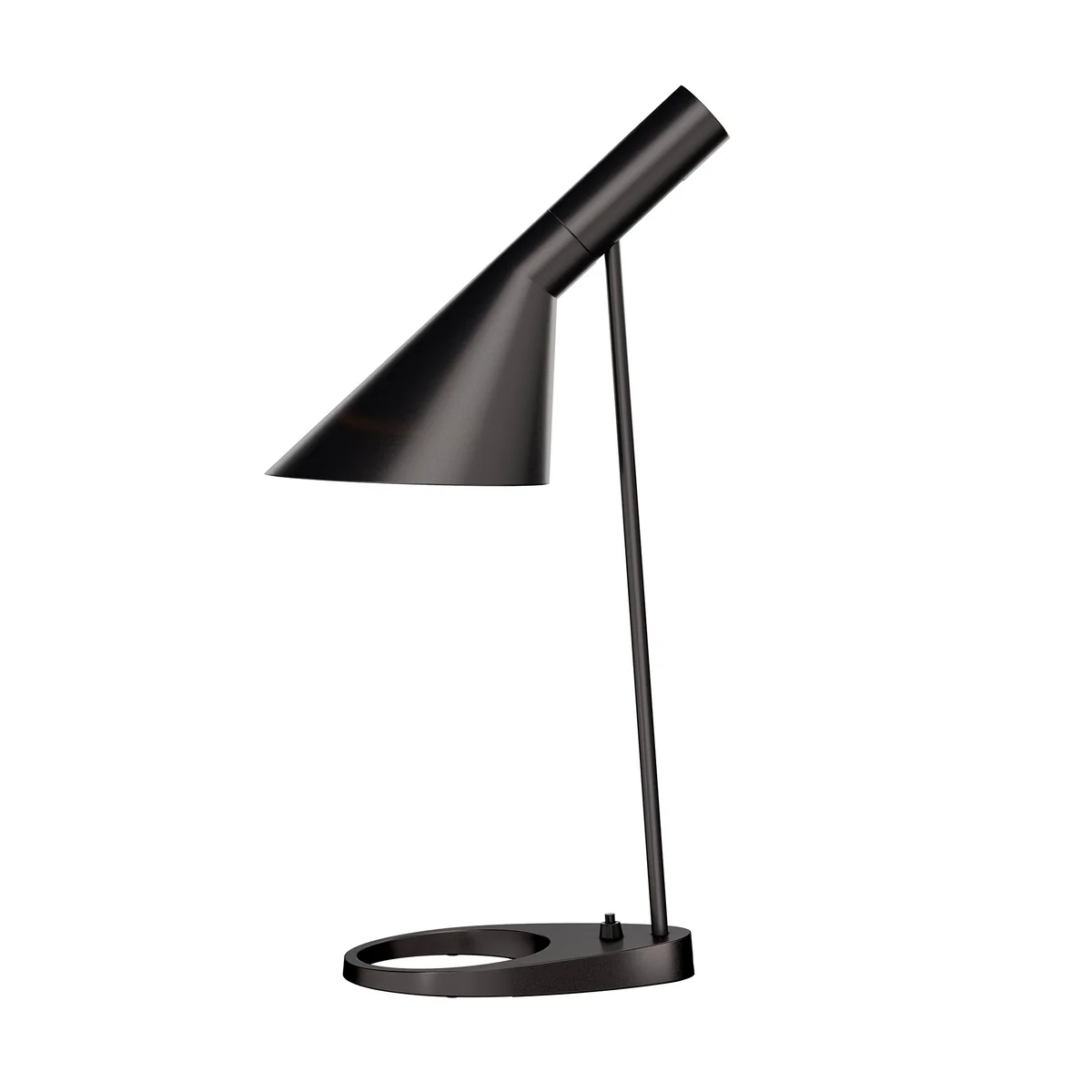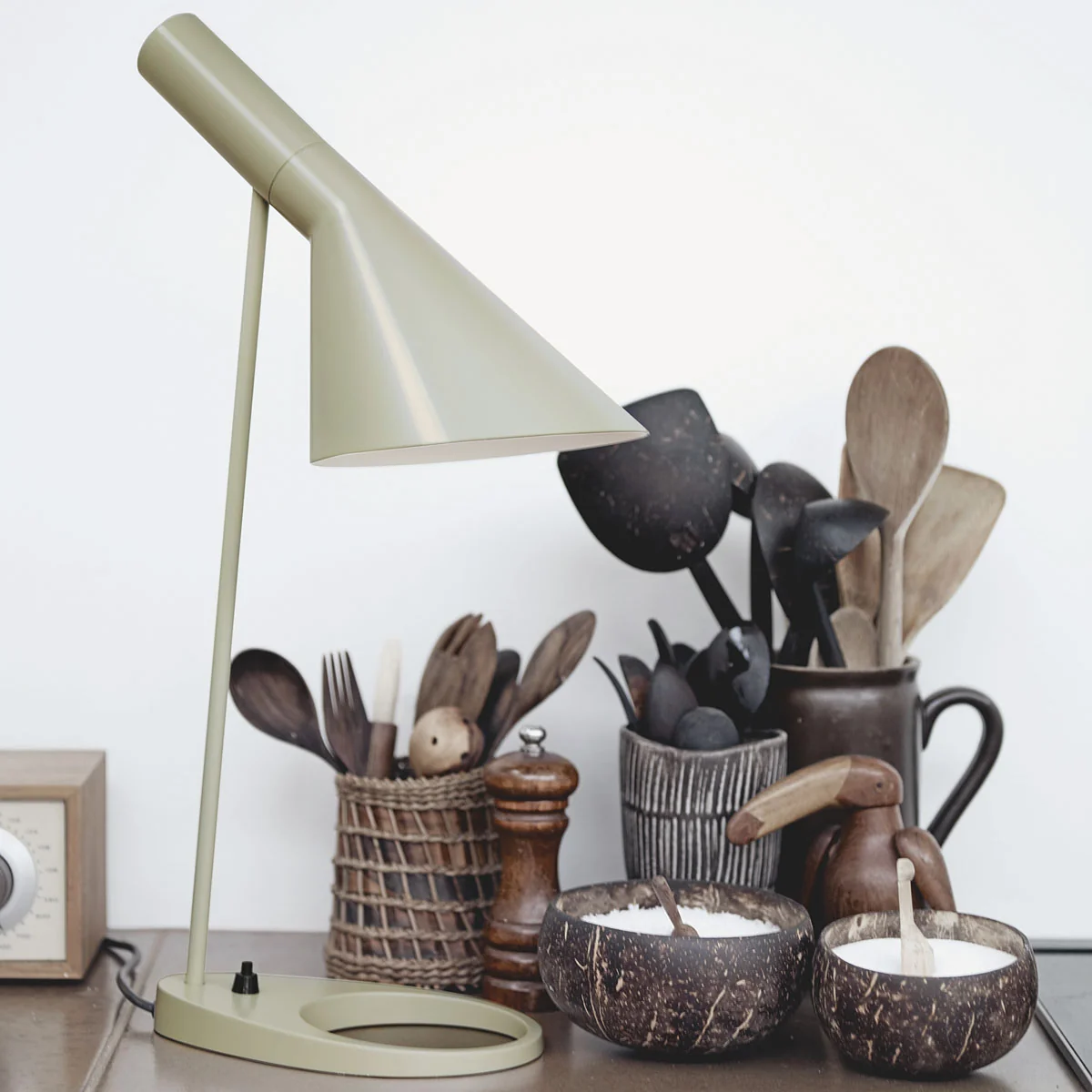 Die AJ-Tischleuchte basiert auf den gleichen Prinzipien wie die AJ-Stehleuchte, zur besseren Nutzung als Arbeitsleuchte wurde der Schirm jedoch vergrössert. Die Winkel des konischen Metallschirms sind so angelegt, dass er dem Winkel des Lampenhalters entspricht. So war es jedenfalls ursprünglich gedacht, aber in Wirklichkeit wurde der Winkel als optische Korrektur etwas angepasst. Wenn die Lampe nach unten gekippt ist, ist der Rand des Lampenhalters horizontal. Das Innere des Schirms ist mattweiss emailliert. Die Abschirmung ist effizient, man kann nicht in die Lichtquelle sehen.