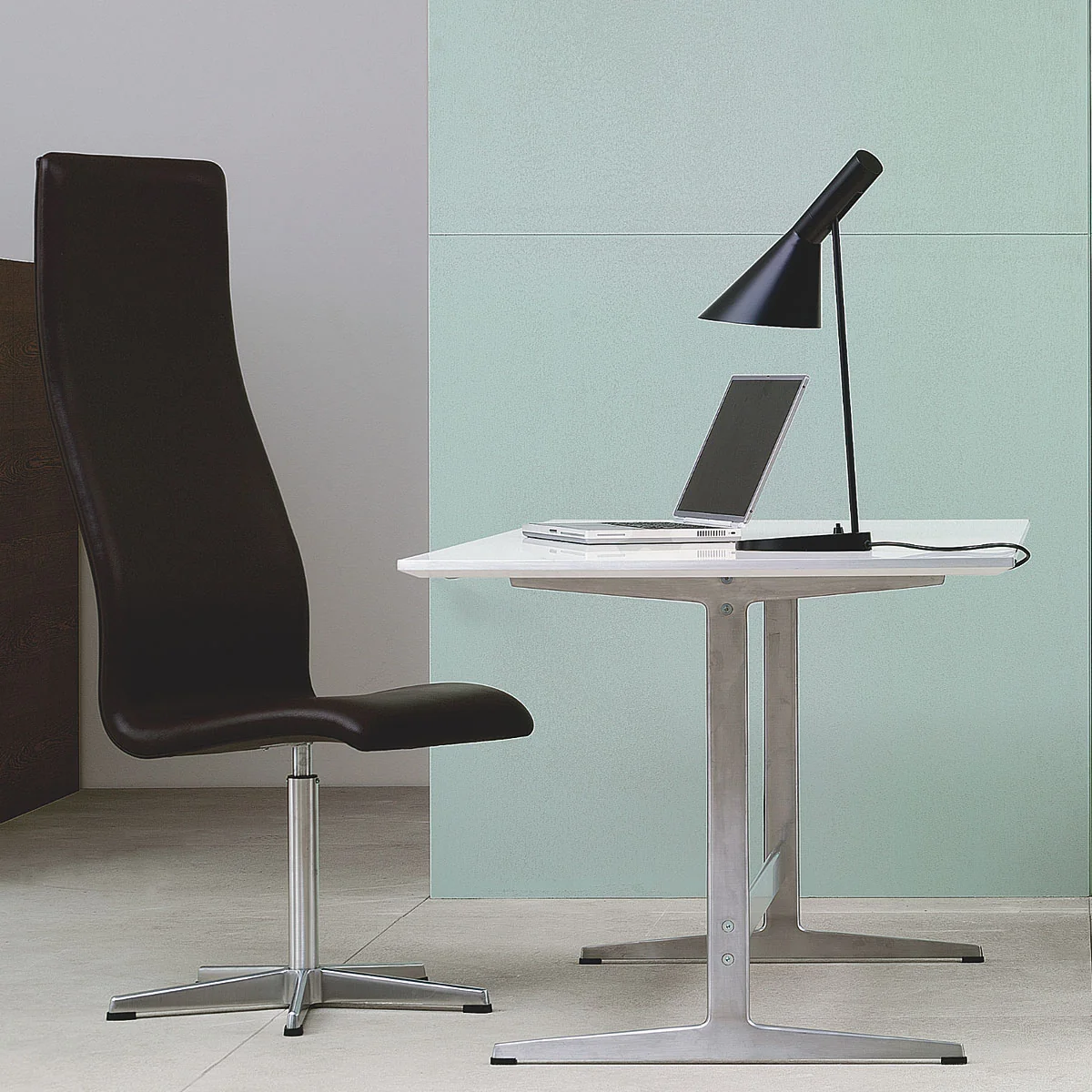 Die AJ Tischleuchte ist ein Entwurf für das Radisson SAS Royal Hotel, das 1960 eingeweiht wurde. Arne Jacobsen schuf nicht nur das Gebäude, er entwarf auch die gesamte Inneneinrichtung, unter anderem Möbel, Besteck, Textilien und Leuchten und schuf damit eines der ersten Design-Hotels der Welt.