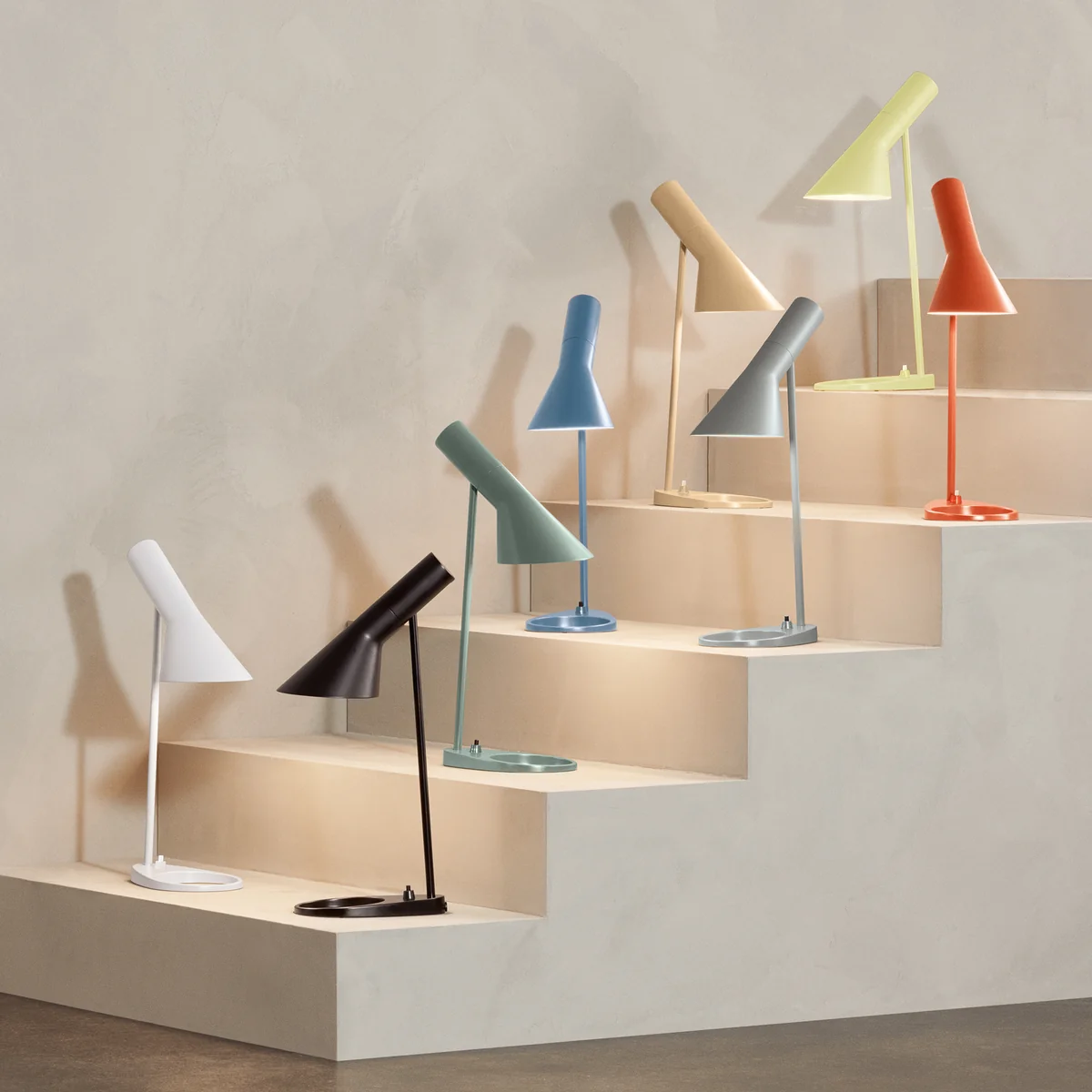 Mit den AJ Tischleuchten ehrt Louis Poulsen den Designer Arne Jacobsen und feiert den 60. Geburtstag der AJ Leuchtenserie. Die Kollektion umfasst sowohl klassische als auch zeitgenössische Farben, die sorgfältig ausgewählt wurden und zu der bereits vorhandenen Farbwelt von Arne Jacobsen passen. Dunkelgrün, Ocker, Rostrot, Midnight Blue, Aubergine sowie zwei Grautöne stehen zur Auswahl.