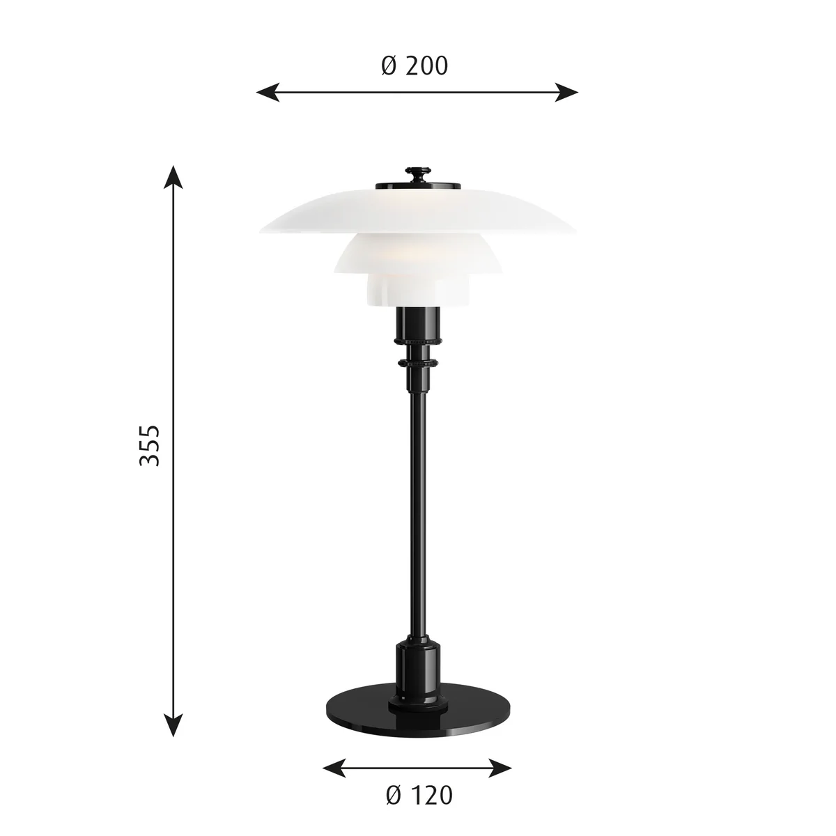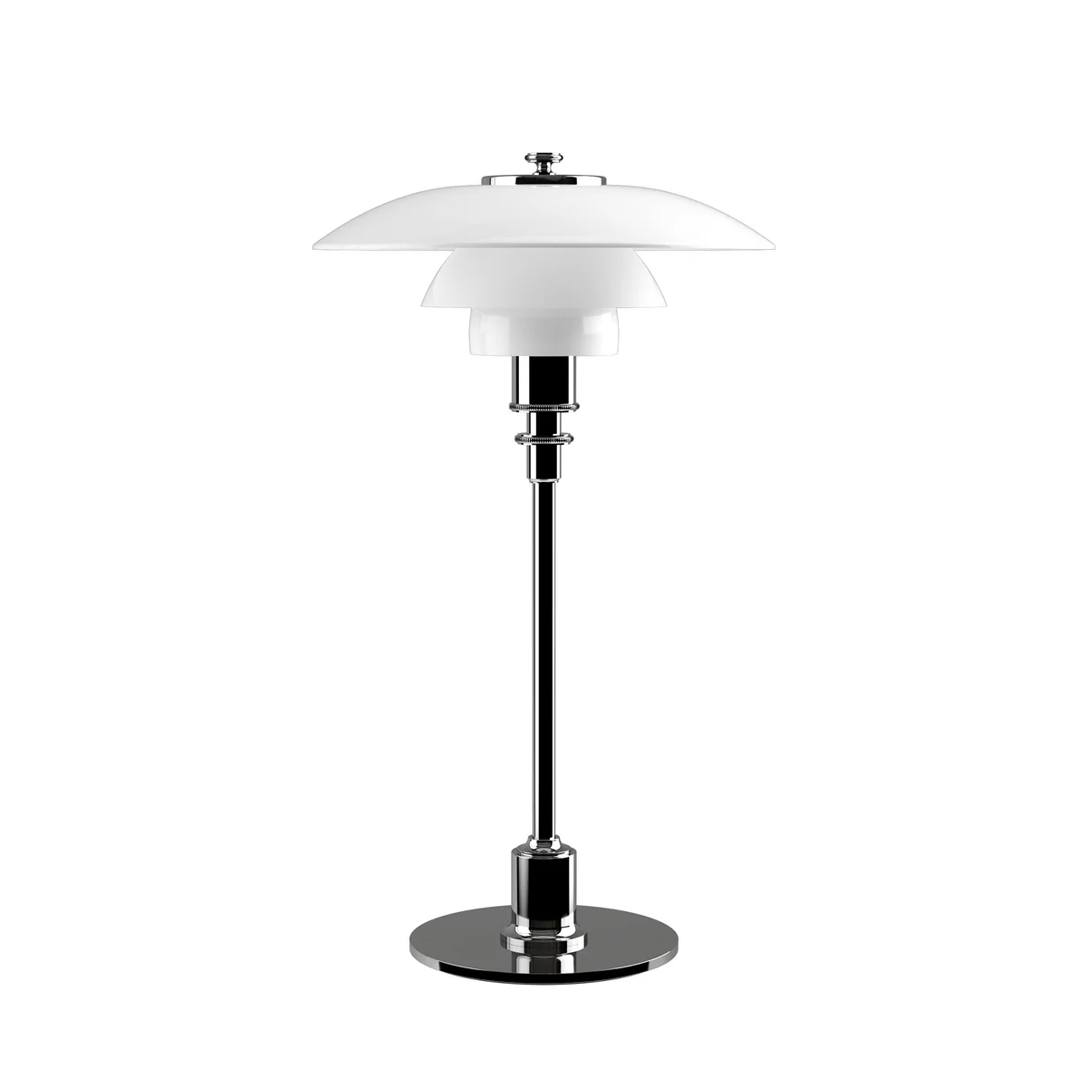Gestaltet wurde die kleine Tischleuchte PH 2/1 ausgehend vom Prinzip eines reflektierenden Dreischirmsystems, das den grössten Teil des Lichts nach unten leitet. Die drei Schirme werden von Louis Poulsen aus mundgeblasenem opalisiertem dreischichtigem Glas hergestellt. Innen sind die Schirme glänzend und aussen sandgestrahlt, was zu einer weichen und diffusen Lichtverteilung führt. Der Sockel ist wahlweise aus gezogenem Aluminium in hochglanzverchromt, Messing oder schwarz metallisiert erhältlich. Das Textilkabel ist Schwarz.