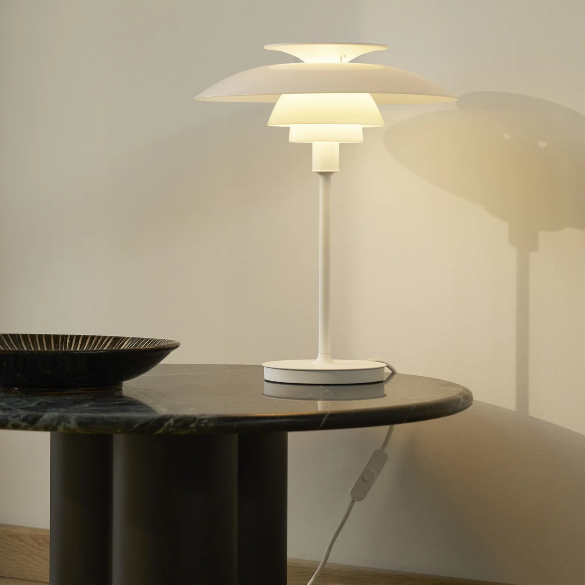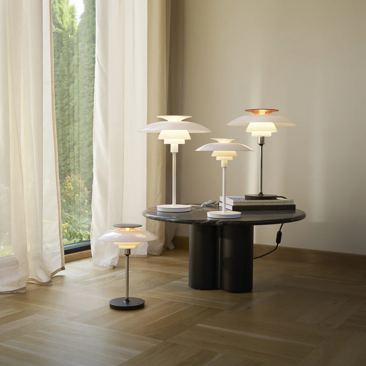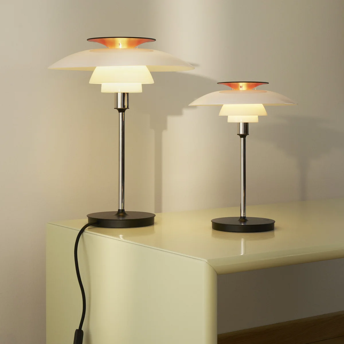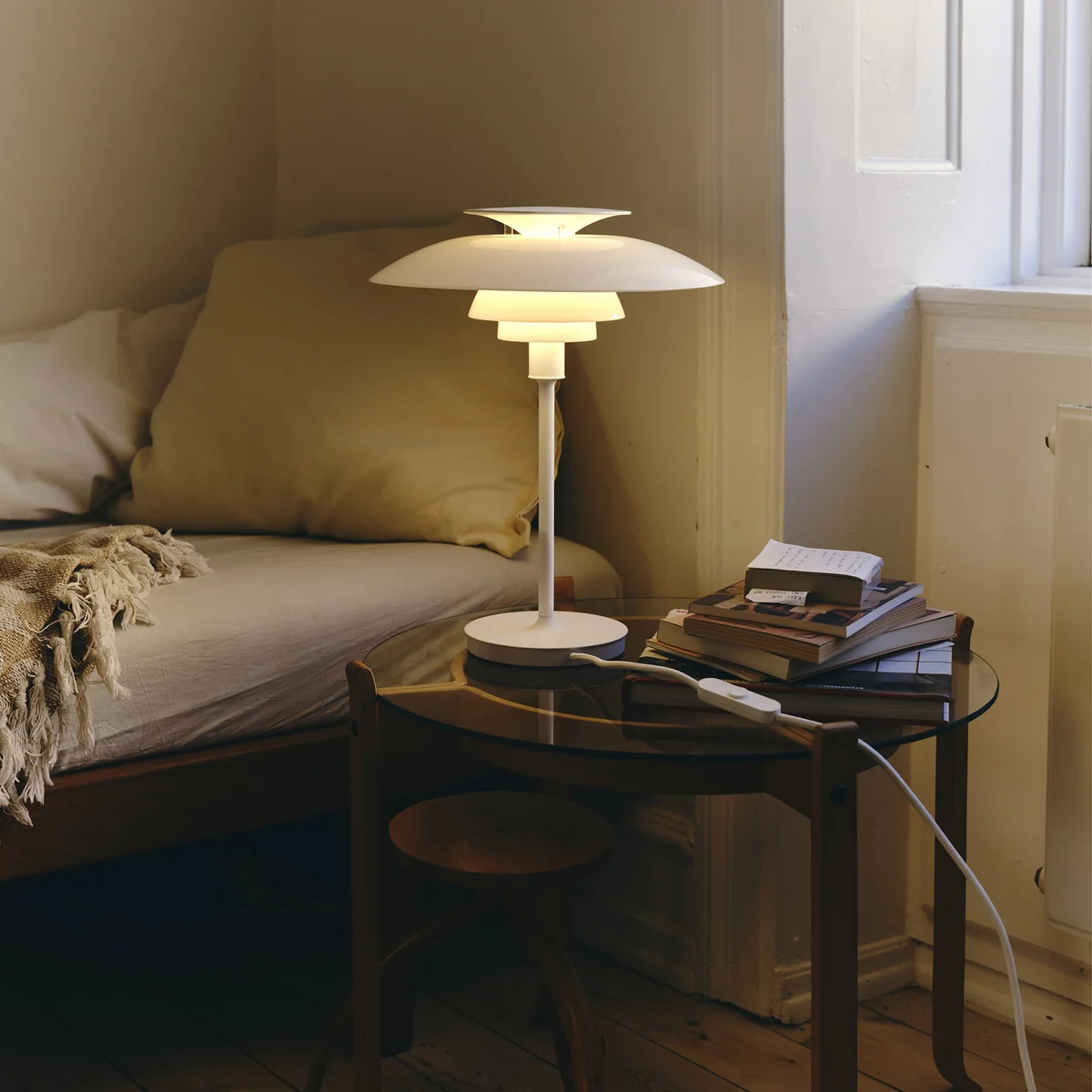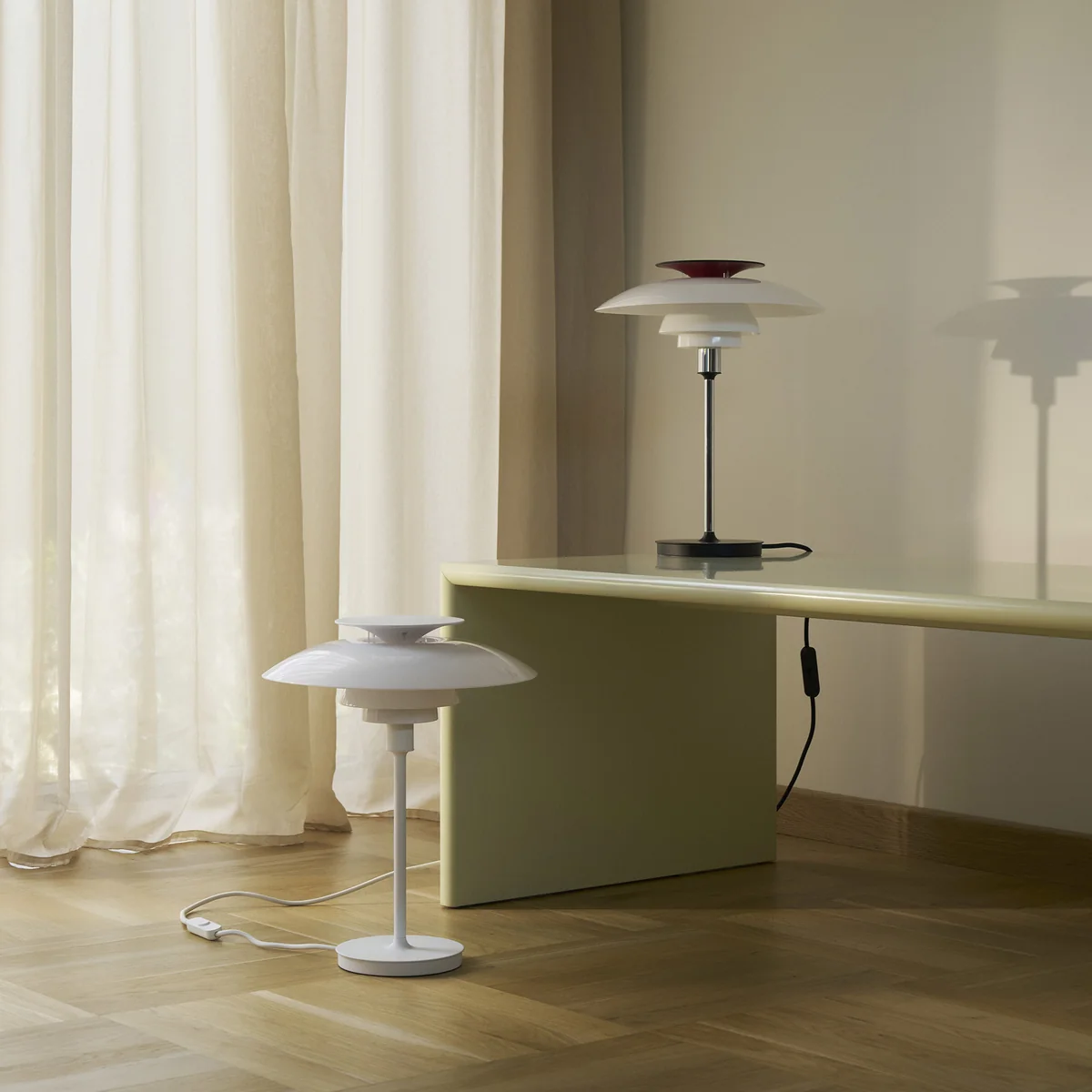 Die PH 80 Tischleuchte wurde 1974 als Hommage an den dänischen Designer Poul Henningsen entworfen – anlässlich seines 80. Geburtstags. Sie gehört zur berühmten PH-Serie, die Henningsens Prinzip der blendfreien Beleuchtung durch ein System mehrerer Schirme verkörpert. Mit ihrer harmonischen Formensprache und ihrem sanften, indirekten Licht ist sie ein Symbol skandinavischer Designtradition.