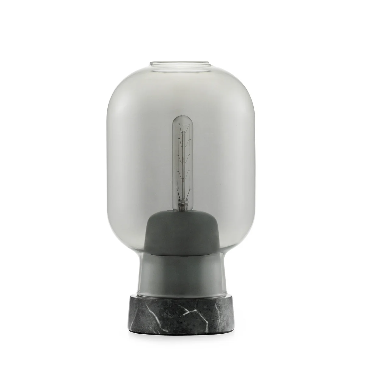 Simon Legald erzählt: "Manchmal kann man gar nicht genau sagen, warum eine Idee für ein neues Objekt entsteht. Aber in diesem Fall stammt die Inspiration direkt von einem Radio und Hi-Fi-Geräten. Das zeigt sich in der Gestaltung von Amp ganz deutlich. Die runde, durchsichtige Form einer Röhre hat etwas ganz Besonderes. Ich fand, dass sie sehr gut zu einer Lampe passen würde. Ich habe eine Glassorte gewählt, die unter anderem auch für Sanduhren verwendet wird. Die Form sollte kurvig und tailliert sein. Als Gegengewicht zum zierlichen Glas habe ich Marmor gewählt. Ich finde, die beiden Materialien passen gut zusammen."