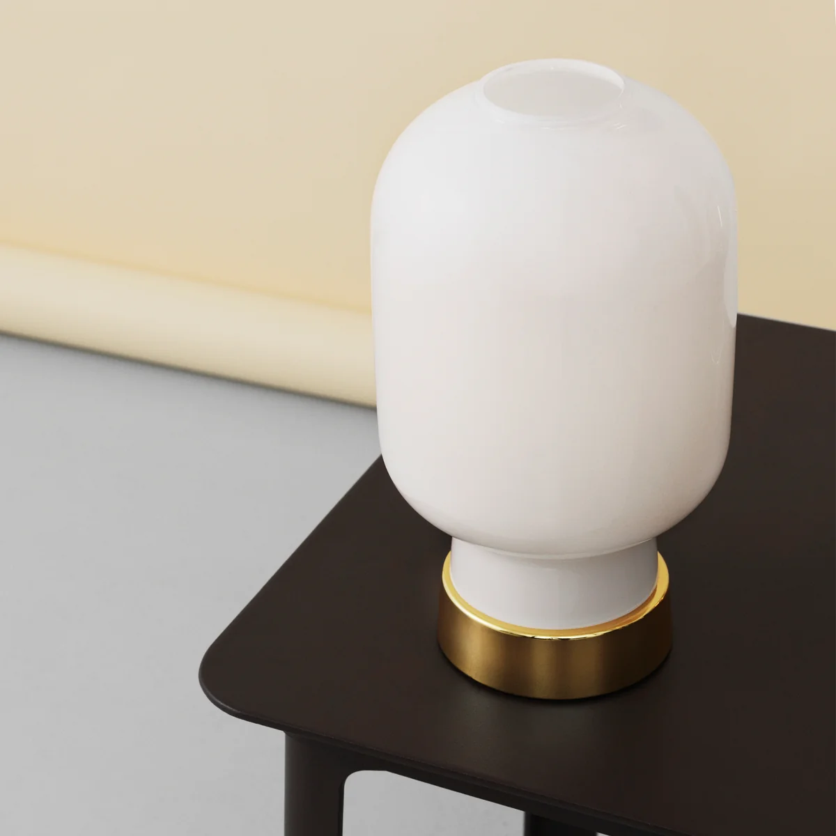 Normann Copenhagen und Legald haben die funktionellen Details betont, zum Beispiel die Art und Weise, wie der Schirm bei der Amp Tischleuchte auf dem Sockel ruht. Die Verbindung der Materialien ergibt einen interessanten Kontrast zwischen dem transparenten, leichten Glas und dem massiven, schweren Marmor- oder Messingsockel.