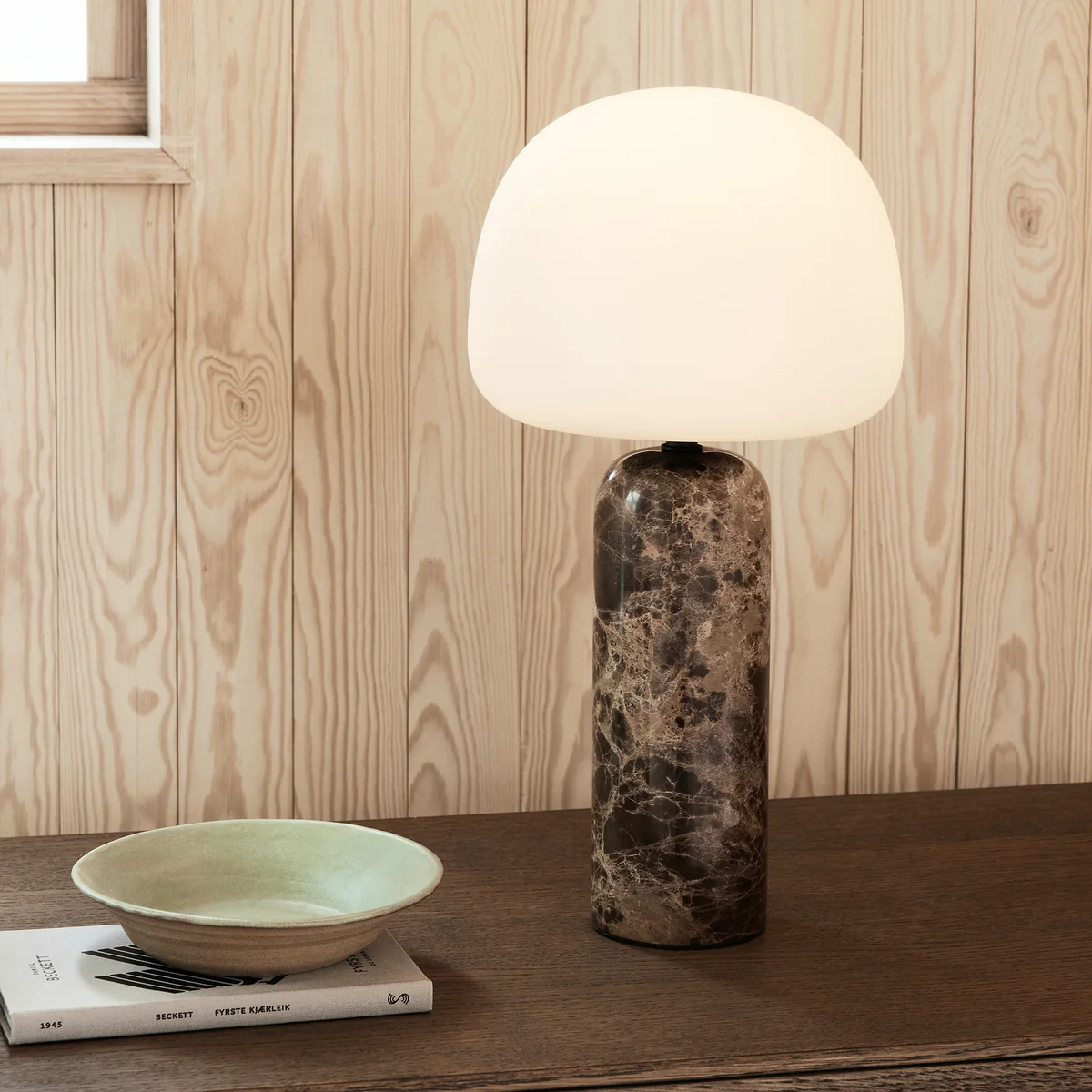 Die Kin Tischleuchte, entworfen vom renommierten norwegischen Designerduo Morten & Jonas, besticht durch ihre zeitgemässe Ästhetik und hochwertigen Materialien. Inspiriert von der Form sammelbarer Wackelkopffiguren, thront der mundgeblasene, matt opale Glasschirm elegant auf einem weich gerundeten Sockel aus poliertem Emperador-Marmor.