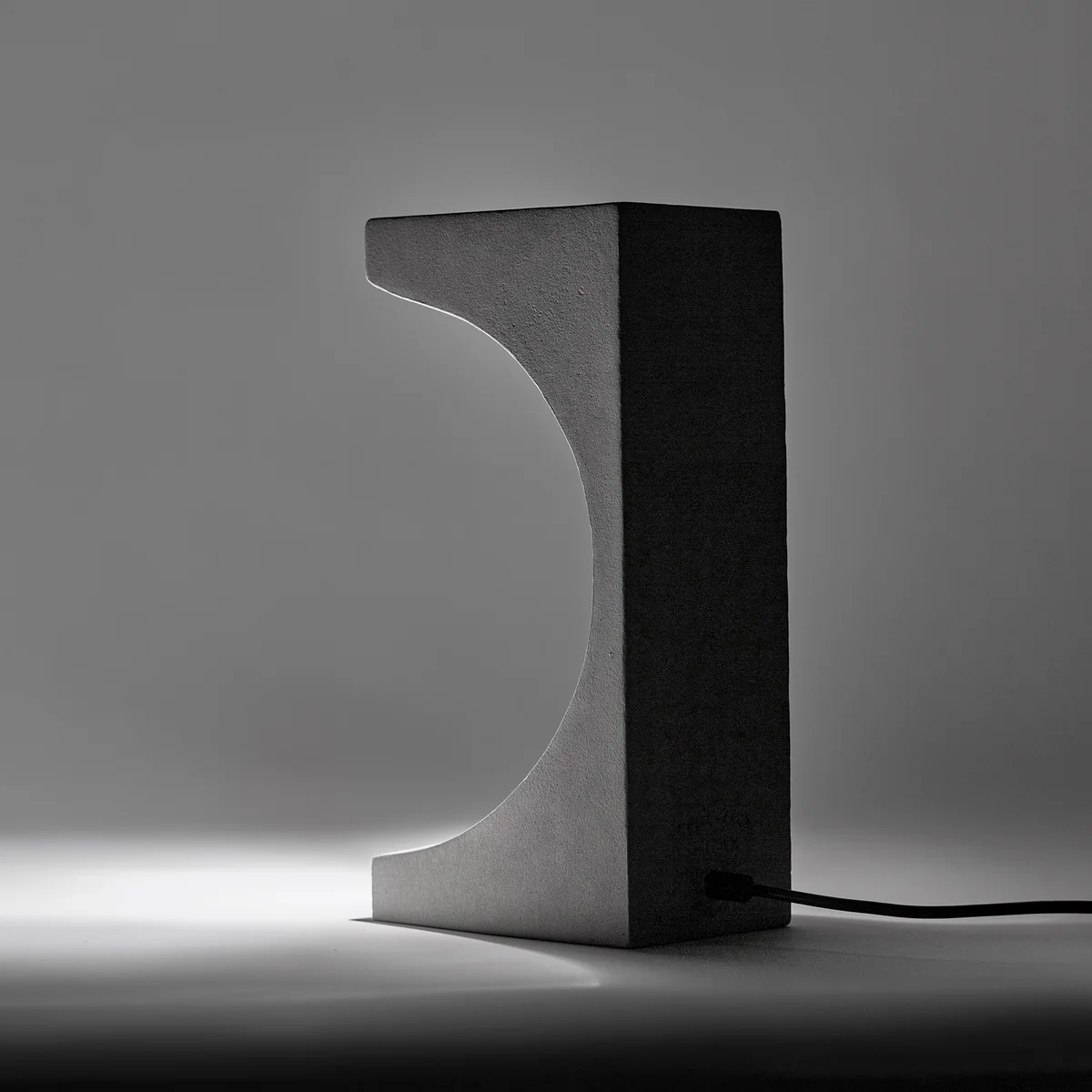 Die Tangent Tischleuchte von Serax, entworfen von Patrick Paris, vereint rohe Ästhetik und skulpturale Eleganz. Gefertigt aus grauem Beton, erinnert die Form der Leuchte an die klaren, kraftvollen Linien eines Brückenbogens. Mit ihrer architektonischen Anmutung fügt sich die Tischleuchte harmonisch in moderne und minimalistische Wohnräume ein.