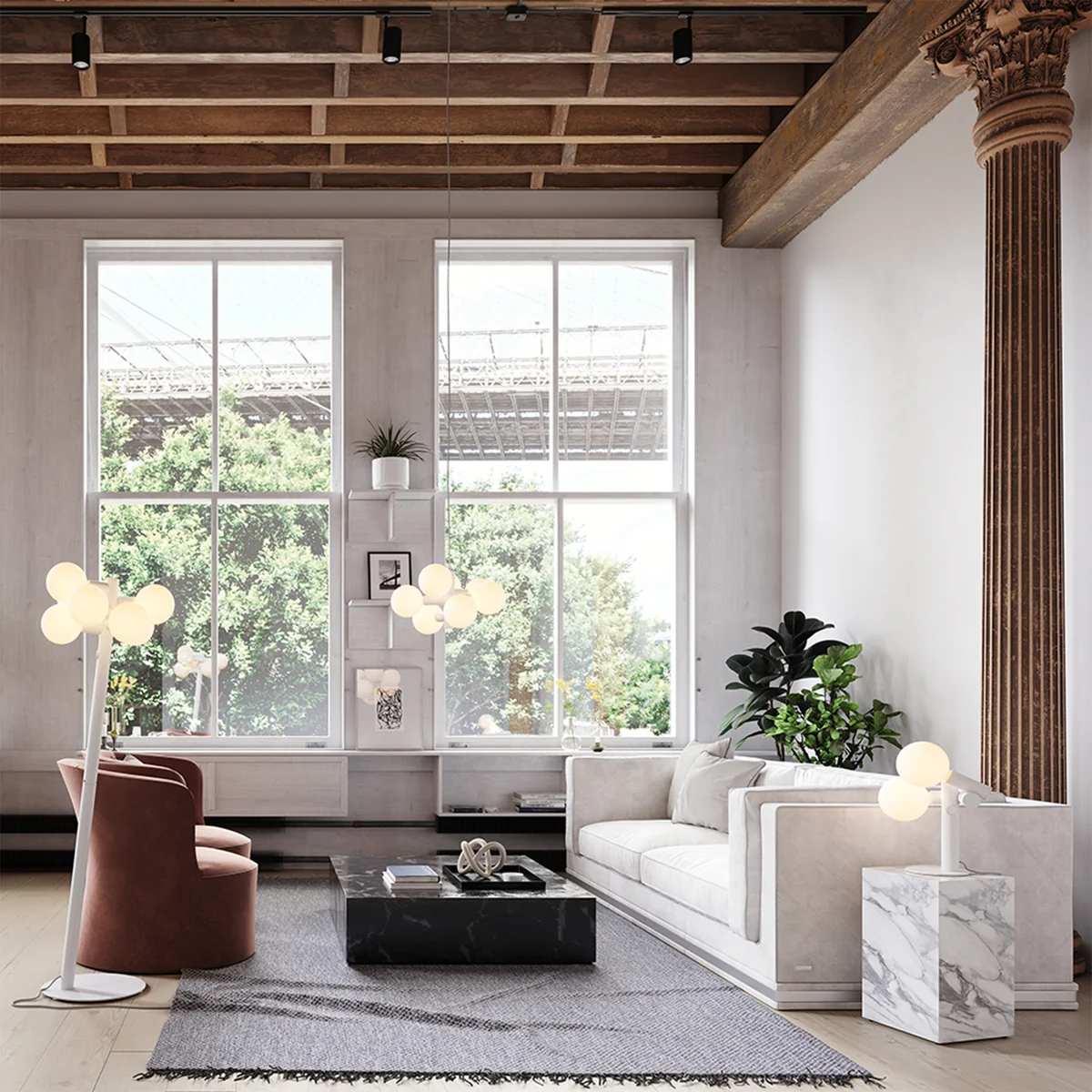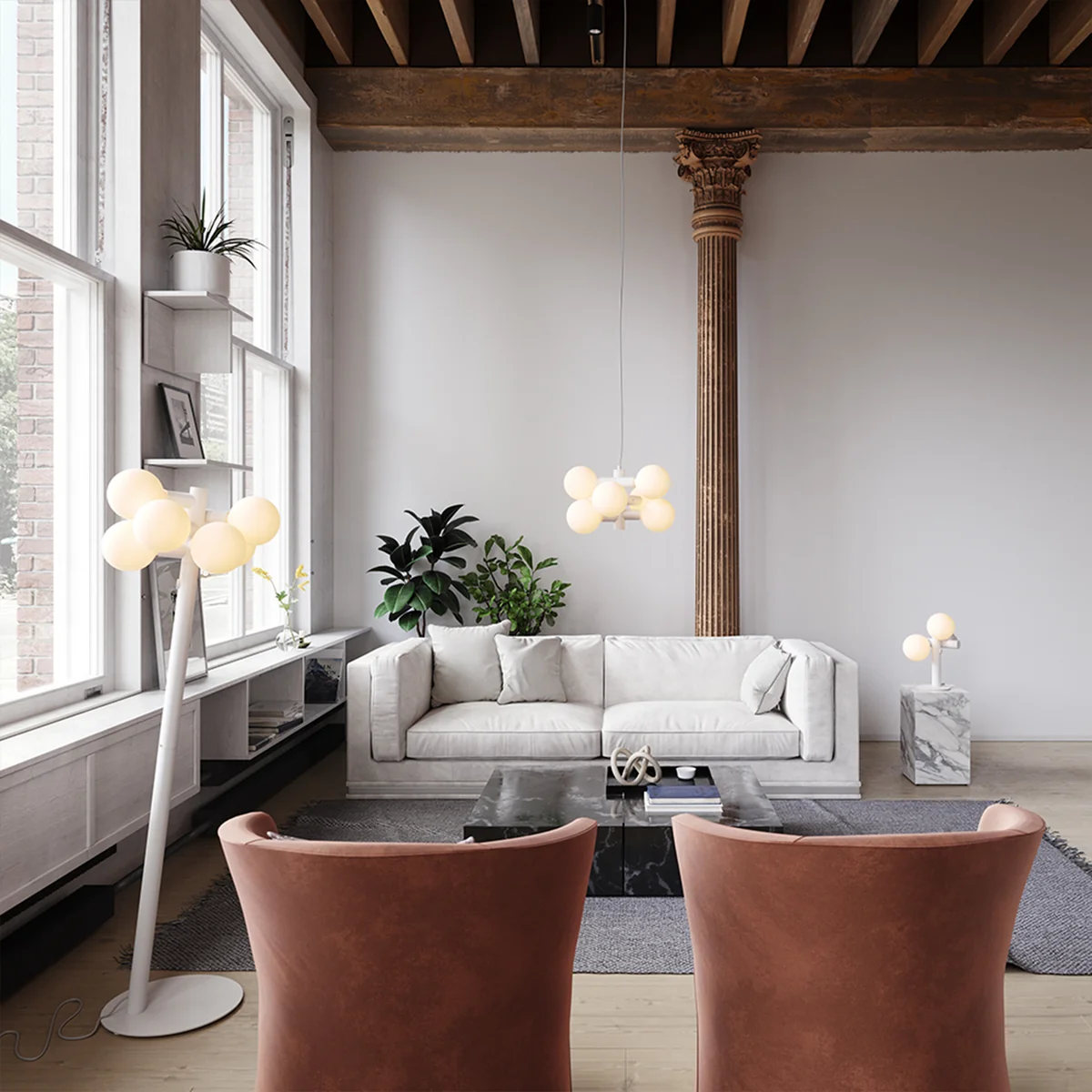 Die Echo Tischleuchte besteht aus drei sich kreuzenden Stahlzylindern mit einem speziellen Drehdimmer am Fuss und ist mit einer gedämpften weissen Pulverbeschichtung versehen. Die Echo Tischleuchte wird mit zwei Sphere IV Glühbirnen geliefert, die eine unübertroffene Dim to Warm Leistung bieten.