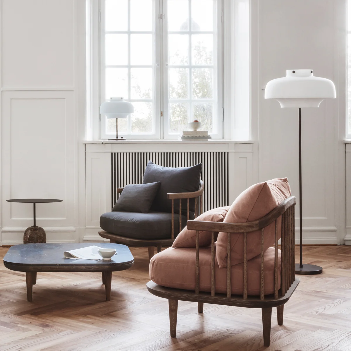 Hergestellt wird die LED-Leuchte mit einem Schirm aus mundgeblasenem Opalglas. Dieser wird von einer filigranen Stange und einem runden Sockel aus bronziertem Messing gehalten. Mithilfe eines kleinen Rädchens wird die Leuchte ein- und ausgeschaltet und das Licht von Kaltweiss zu Warmweiss reguliert. Passend dazu ist die Copenhagen SC14 Stehleuchte erhältlich.