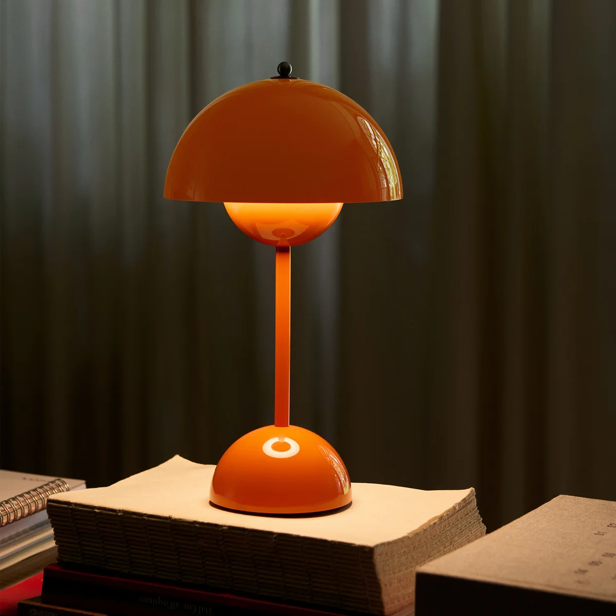 Die Flowerpot Akku-Tischleuchte VP9 von &Tradition, eine fröhlich gefärbte Leuchte mit einem runden Sockel und einem runden Schirm, verkörpert die experimentelle Haltung von Designer Verner Panton. Leicht, kompakt und vor allem mit einem wiederaufladbaren Akku ausgestattet, ist die tragbare VP9 die perfekte Lichtquelle für gemütliche Abende – ob im Wohnzimmer oder auf der Terrasse.