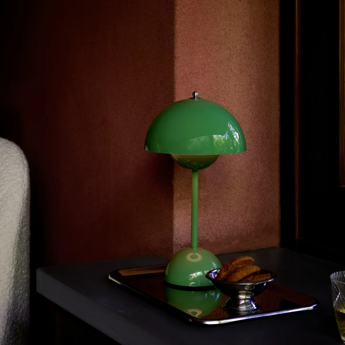 Die Flowerpot Akku-Tischleuchte VP9 von &Tradition, eine fröhlich gefärbte Leuchte mit einem runden Sockel und einem runden Schirm, verkörpert die experimentelle Haltung von Designer Verner Panton. Leicht, kompakt und vor allem mit einem wiederaufladbaren Akku ausgestattet, ist die tragbare VP9 die perfekte Lichtquelle für gemütliche Abende – ob im Wohnzimmer oder auf der Terrasse.