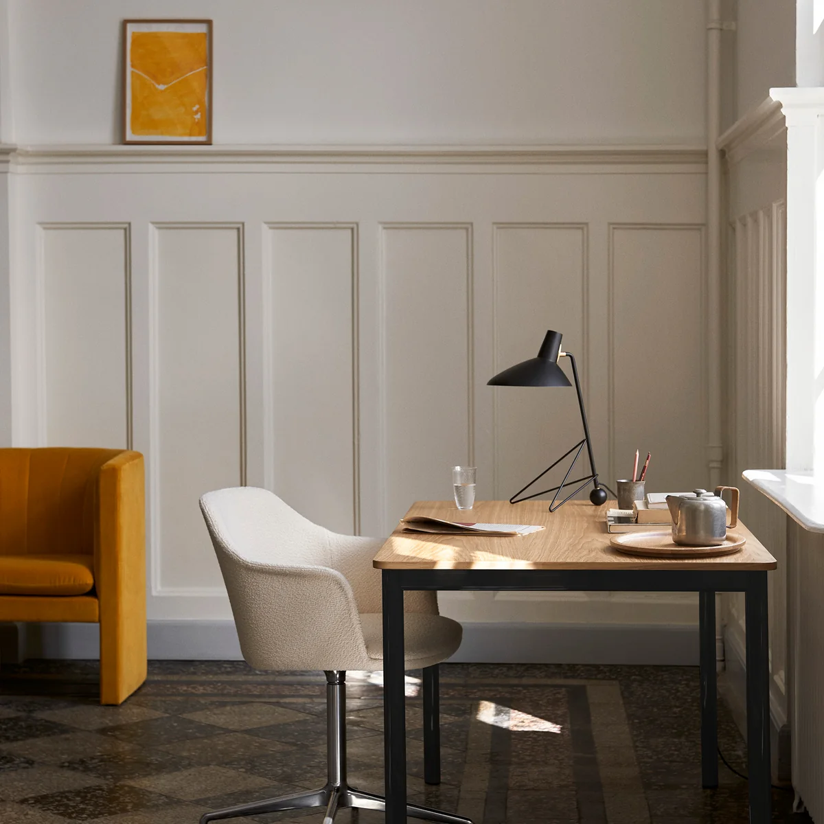 Die Tripod HM9 Tischleuchte von &Tradition ist eine minimalistische Leuchte, die den Stil des legendären Design-Studios Hvidt & Mølgaard widerspiegelt. Sie zieht ihre eindrucksvolle Gestaltung aus ihren weichen Formen. Gehalten wird die Lampe von einem stabilen Gestell aus Stahl, das gleichzeitig mit seinen sanften und runden Kurven ideal in jedes Ambiente passt - im Wohnzimmer als Leselampe, im Schlafzimmer, dem Flur oder dem Büro.