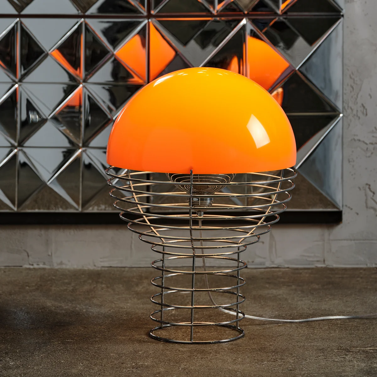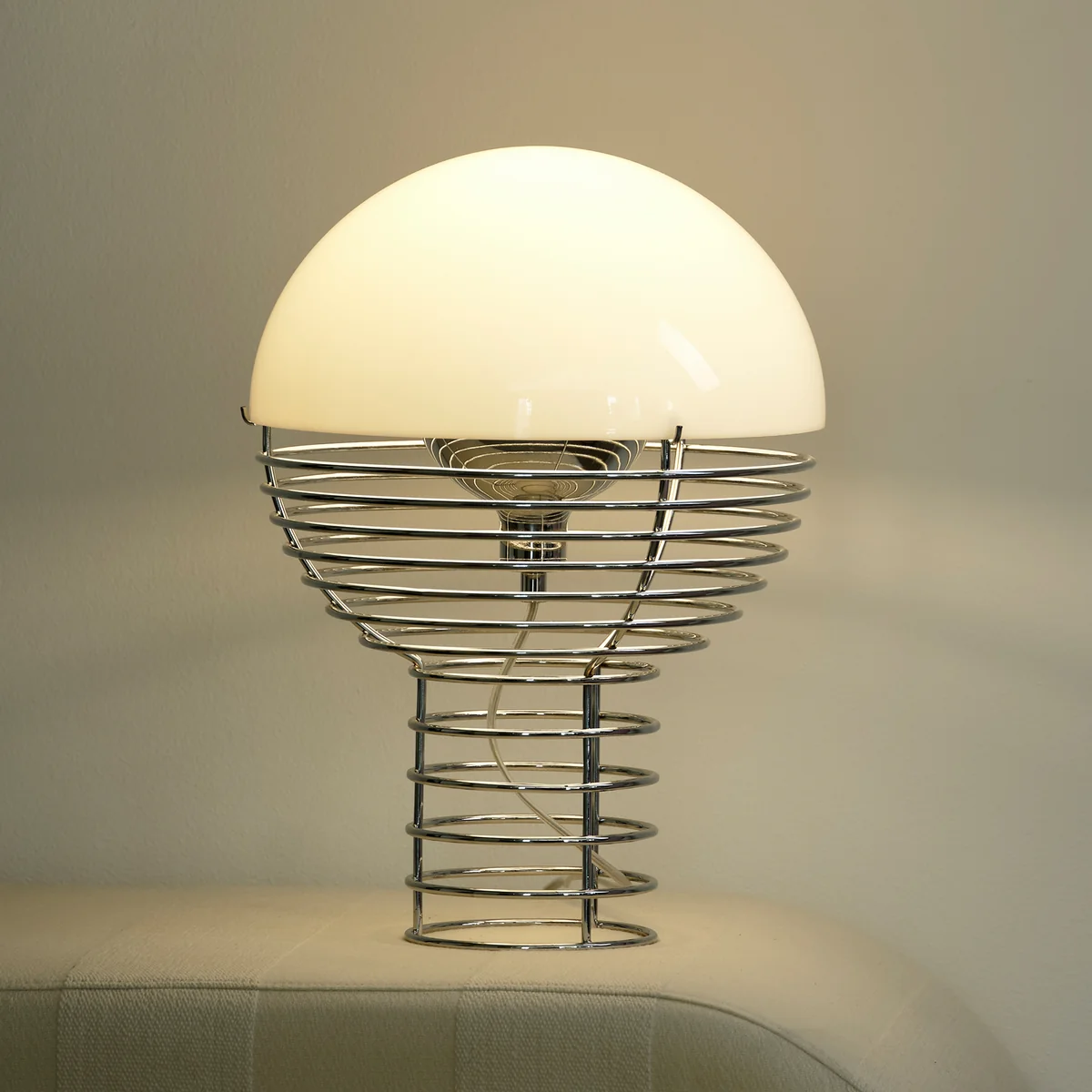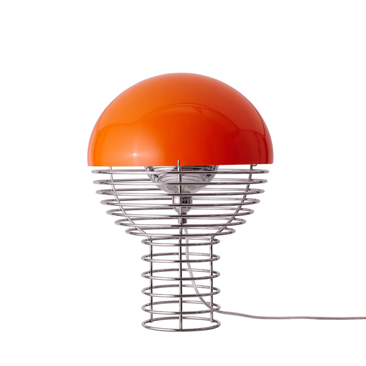 Die 1972 von Verner Panton entworfene Wire Tischleuchte ist Teil einer ursprünglich sehr umfassenden Serie von Tisch- und Stehleuchten. Heute produziert Verpan die Tischleuchten getreu den Entwürfen Pantons aus verchromtem Stahldraht und einem halbkugelförmigen Leuchtenschirm aus Kunststoff. Das Leuchtmittel (E14 für Ø 30 cm bzw. E 27 für Ø 40 cm) im Inneren der Konstruktion ist umgeben von einem Metallreflektor, der das Licht an die Innenseite des Schirms leitet und somit ein diffuses Licht erzeugt.