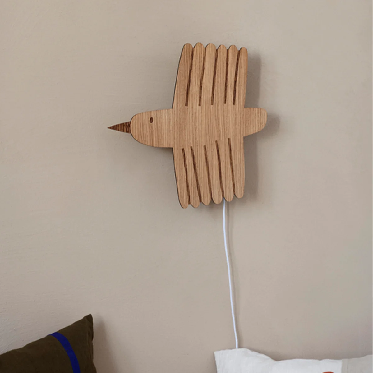 Die Kinder Wandleuchte aus dem Hause Ferm Living begeistern mit ihrem natürlich, organischen Look. Sie sorgen für eine beruhigende Atmosphäre und ein überaus angenehmes, sanftes Licht. Der Leuchtenschirm wird aus geöltem Eichenfurnier gefertigt, die Details werden mit einem Laser eingraviert. Die Leuchte kann ganz simpel an der Wand direkt neben dem Bett anmontiert werden, um so ein optimales Nachtlicht zu bieten. Kombinierbar mit zwei G4 LEDs und max. 2x3 W. Die LEDs sind im Lieferumfang nicht enthalten. 1,90 m langes Kabel vorhanden.