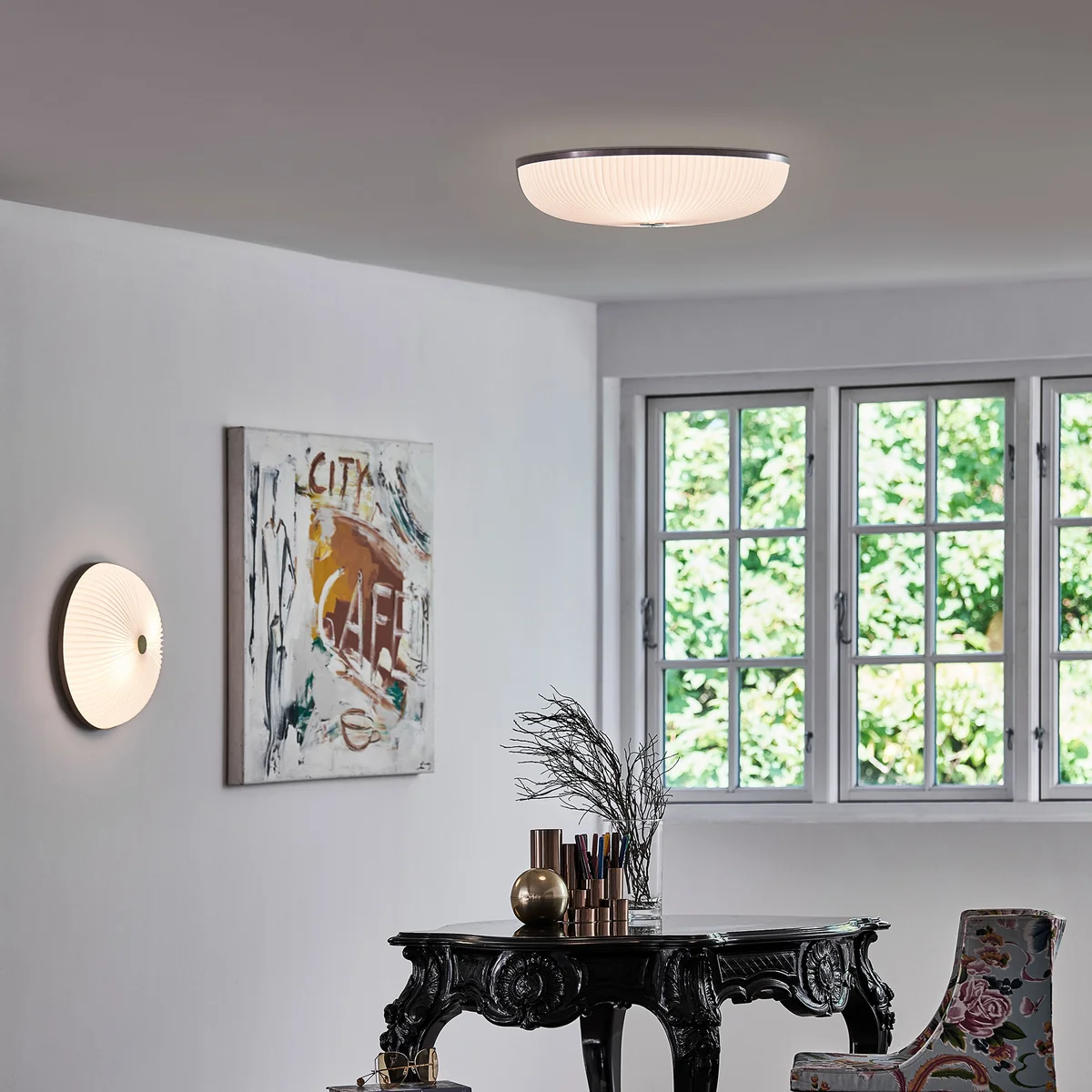 Die Leuchte wird aus Kunststoff hergestellt und ist in verschiedenen Durchmessern erhältlich. Details in Silber oder Gold runden das Design ab und schaffen eine zeitlose Leuchte, die zum Hingucker wird. Sowohl allein als auch in verschiedenen Grössen zu mehreren an Wand oder Decke ist Lamella eine praktische und schöne Beleuchtung.