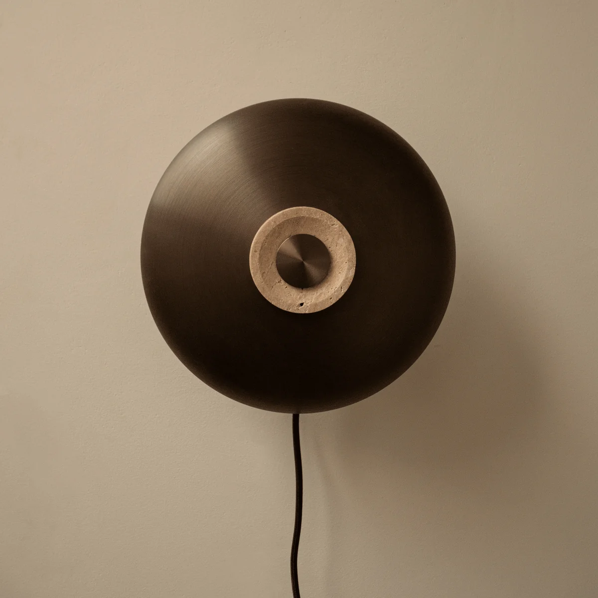 Die Reverse LED Wandleuchte von Audo verbindet rohe Naturmaterialien mit raffinierter Handwerkskunst und schafft eine Balance aus Spannung und Harmonie. Inspiriert von geometrischen Formen, besteht die Wandhalterung aus unbehandeltem Travertinstein, dessen konische Form und natürliche Unregelmässigkeiten die Schönheit organischer Strukturen hervorheben. Im Kontrast dazu steht der geschwungene Schirm aus bronziertem, eloxiertem Aluminium mit einer glatten Oberfläche, die dem Design eine elegante Note verleiht.