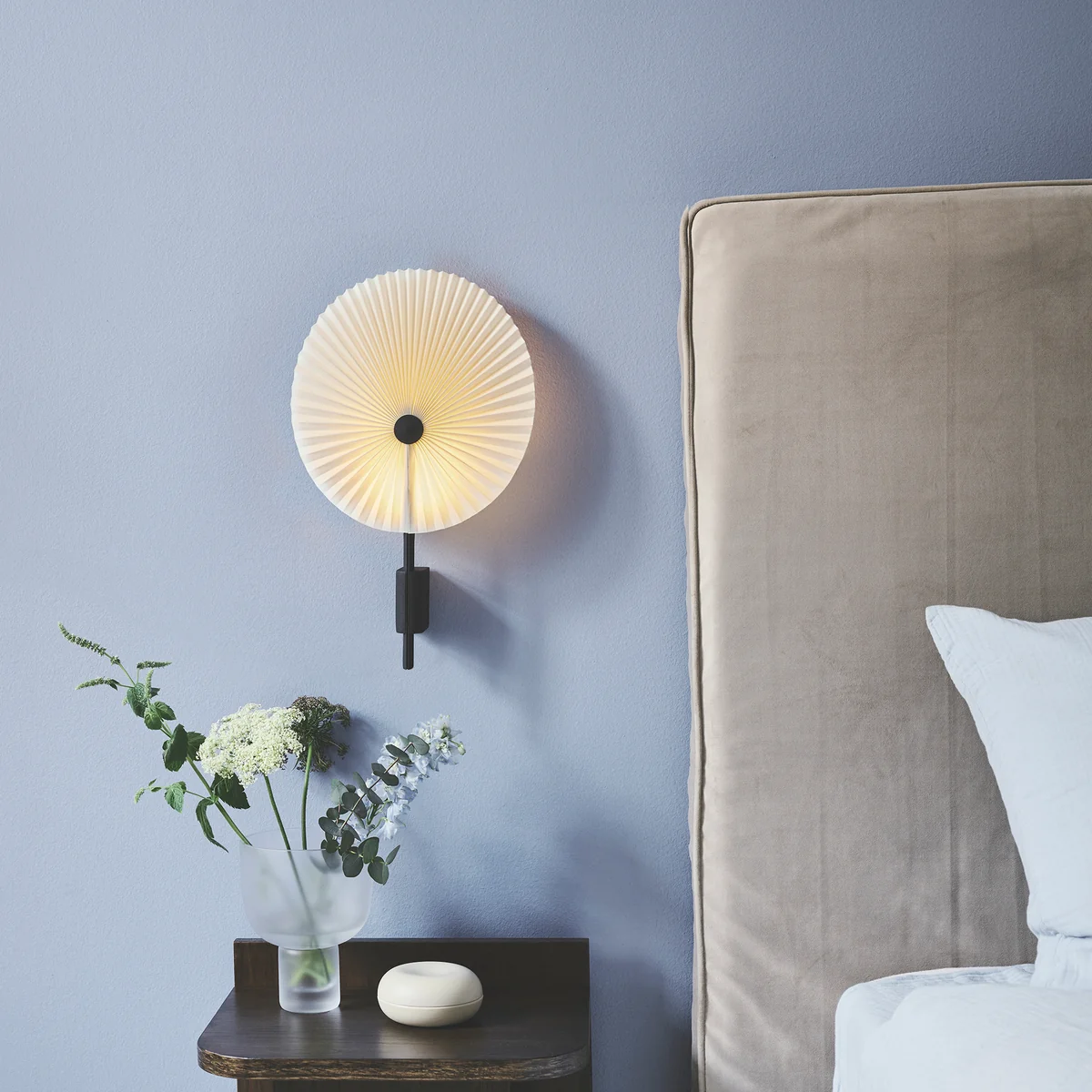 Liris kombiniert handwerkliche Elemente mit moderner Technik und schafft durch die gefaltete Fächerform einen Lampenschirm und Reflektor zugleich. Eine kleine, angehobene LED-Lichtquelle erzeugt ein sanftes, gleichmässiges Umgebungslicht, das beim Positionieren gegen die Wand eine behagliche Atmosphäre schafft.