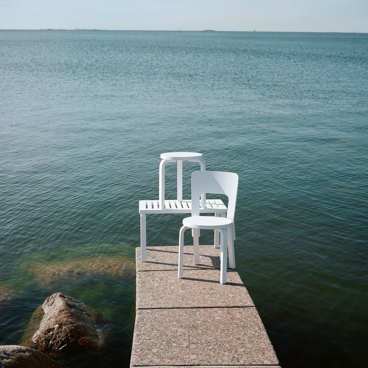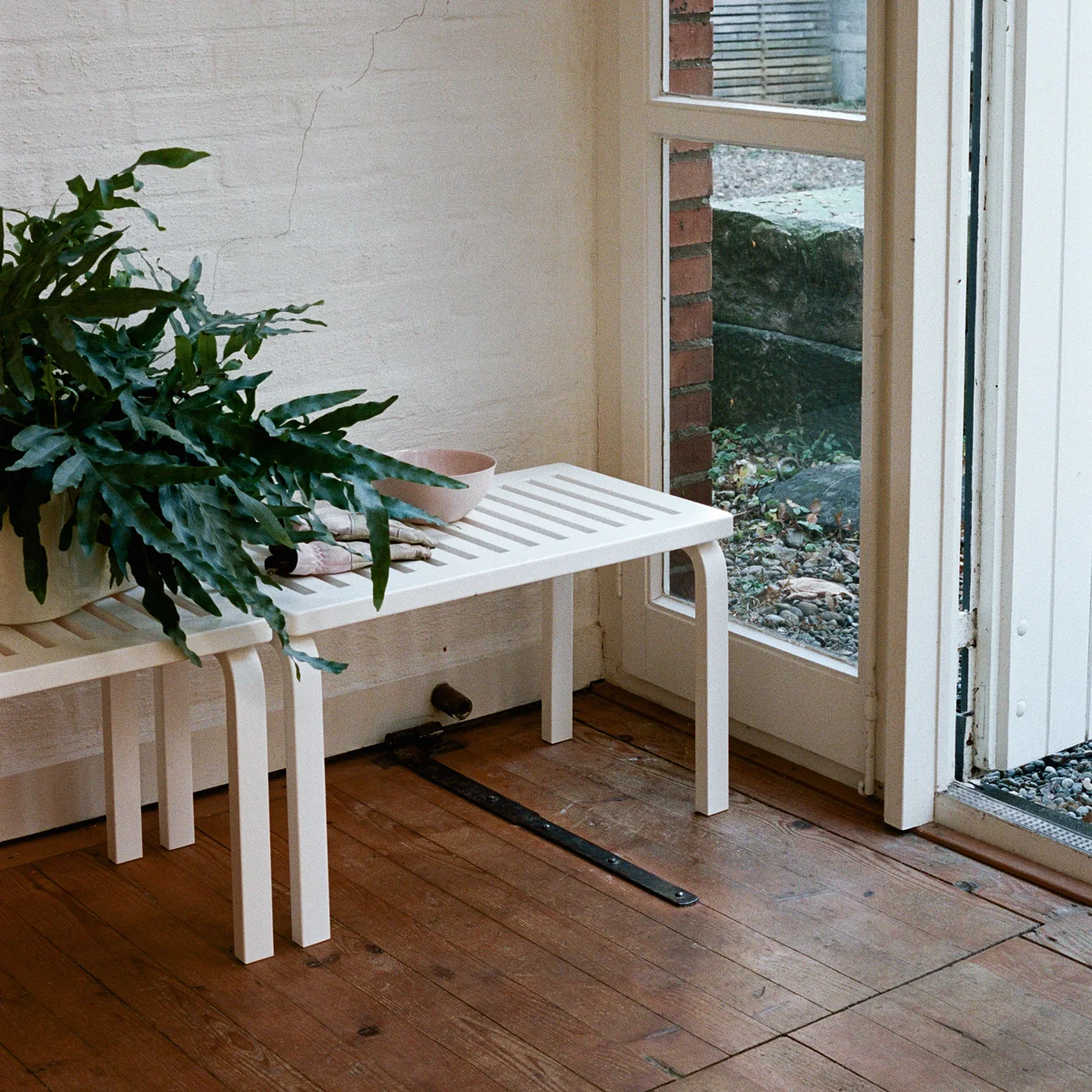 Dank des bahnbrechenden L-Bein-Systems von Alvar Aalto können die Beine direkt am Sitz montiert werden, ohne dass komplizierte Verbindungselemente erforderlich sind. Die 1945 von Alvar Aalto entworfene Bank 153 ist eine späte und beliebte Ergänzung der L-Bein-Kollektion.