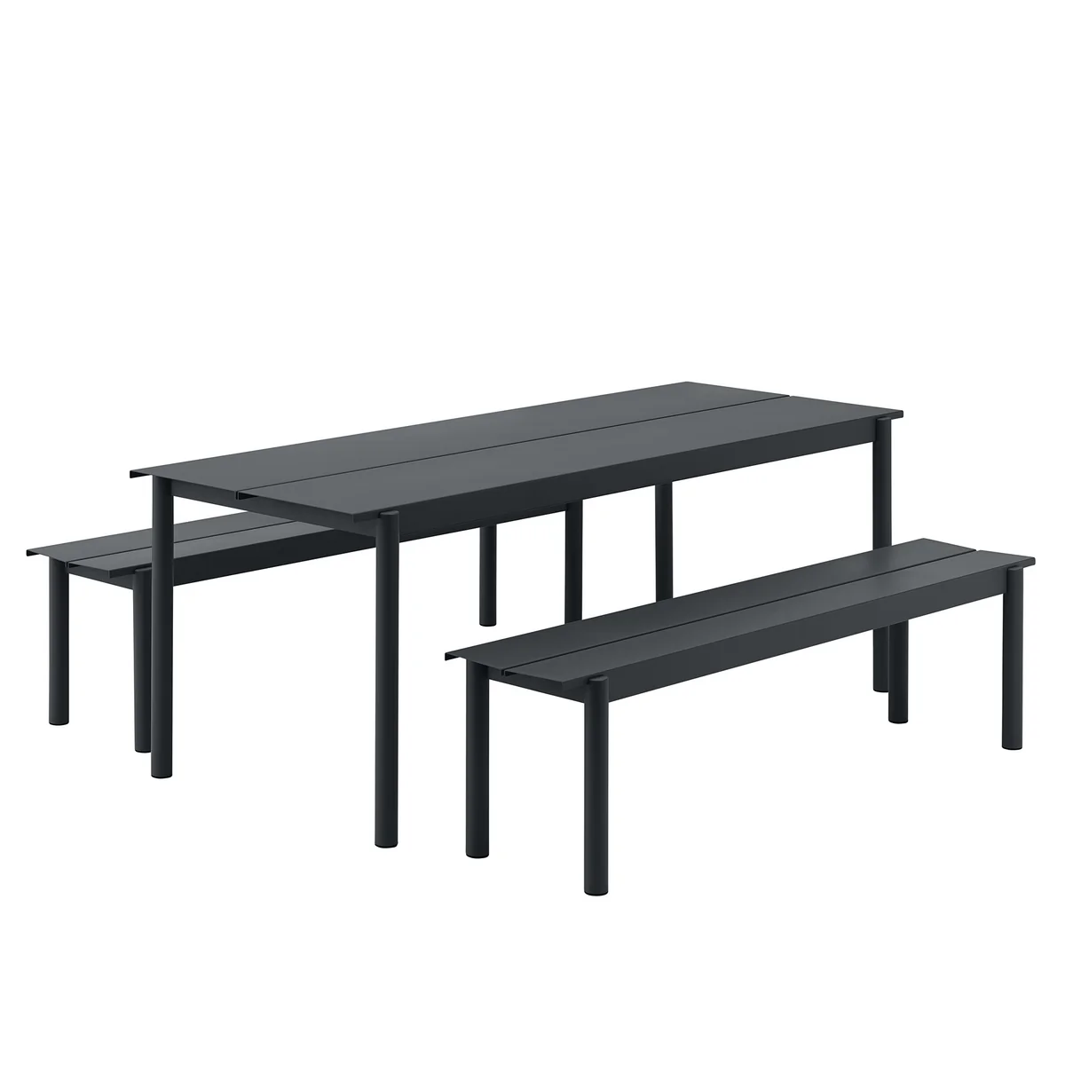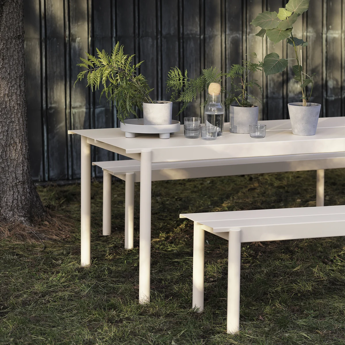 Erhältlich ist die Linear Steel Bank von Muuto in verschiedenen kräftigen sowie zurückhaltenden Farben. Mit dem passenden Linear Steel Tisch lässt sich eine harmonische Sitzgarnitur für den Aussenbereich kreieren.