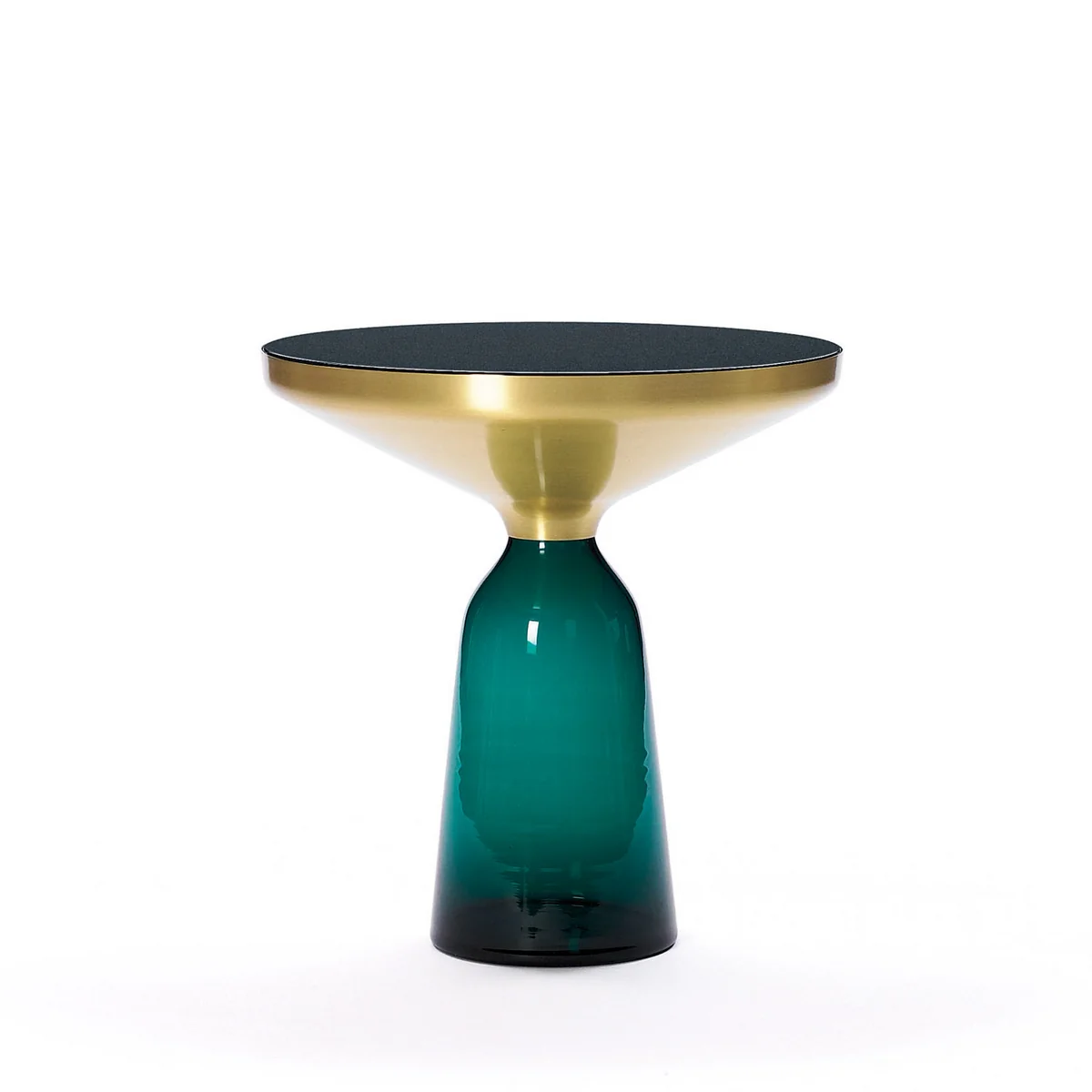 Der Bell Beistelltisch von Sebastian Herkner stellt den gewohnten Umgang mit Materialien auf den Kopf und überrascht die Wahrnehmung: Hier wird er Tischfuss zur prägnanten, farbig-transparenten Glasform im Raum, auf dem ein Metallkörper aufliegt.