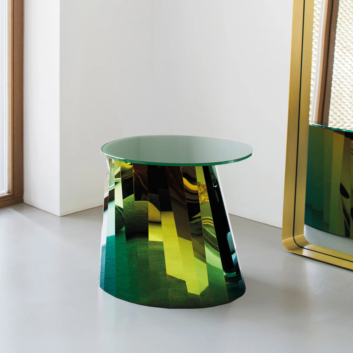 Im Vordergrund stehen das aufwendige Herstellungsverfahren und die hochwertigen Materialien: Der gefaltete Fuss, der aus einem Edelstahlblech besteht, wird nach dem Inox-Spectralverfahren gefärbt. Diese spezielle Oberflächenbehandlung verleiht dem Edelstahl-Fuss, je nach Dauer der Anwendung, verschiedene Farben. Die ovale Tischplatte besteht aus dickwandigem Kristallglas, das in einer glänzenden oder einer satinierten Ausführung erhältlich ist und von unten farbig lackiert wird.