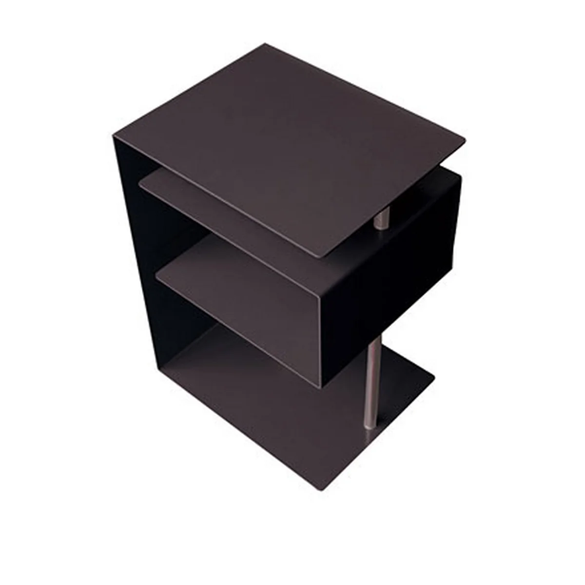 Der x-centric Tisch von Radius Design besteht aus pulverbeschichtetem Stahl. Das Edelstahlrohr, das als Achse für das ausklappbare Ablagefach dient, ist mit einer Acrylglas-Schicht überzogen.