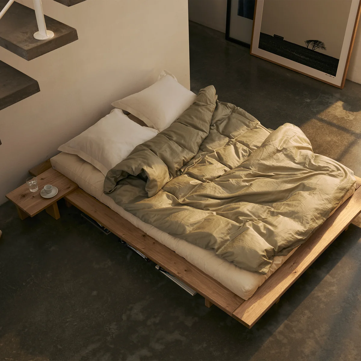 Das Japan Bett von Karup Design besteht aus einem Rahmen mit acht Füssen, das ca. 20 cm über dem Fussboden schwebt. Es wird aus nachhaltigem Kiefernholz oder Eichenholz hergestellt und ist in verschiedenen Lackierungen erhältlich. Passend gibt es den Japan Nachttisch.