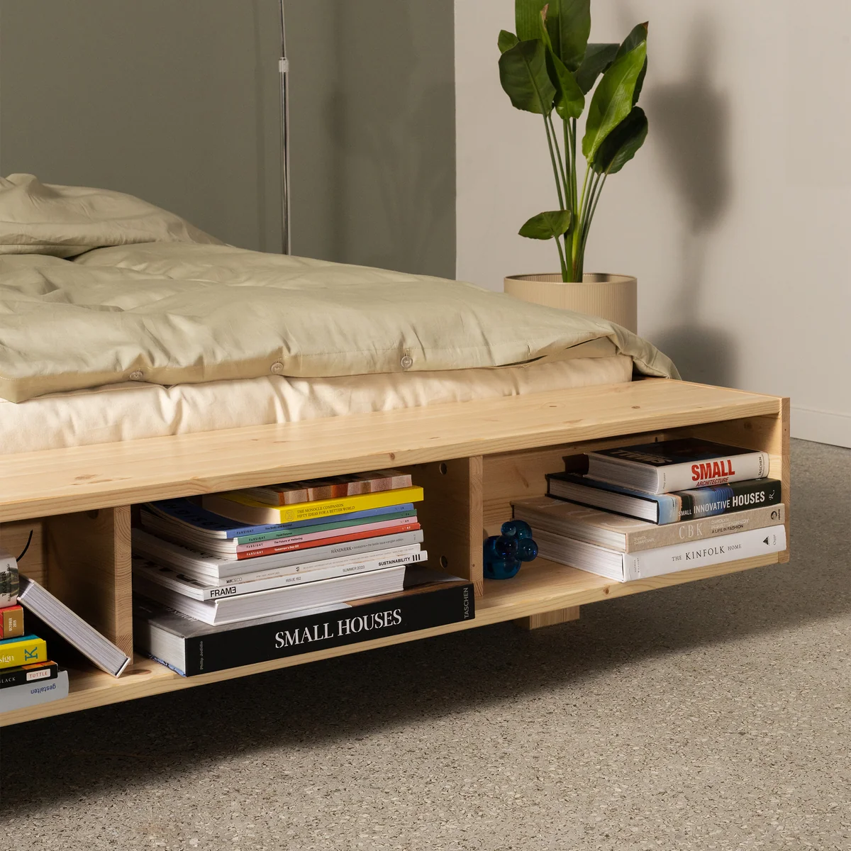 Das besondere Highlight: Am Fussende des Bettes befindet sich ein offener Stauraum mit drei Fächern – ideal, um Bücher, Decken oder persönliche Lieblingsstücke stilvoll und griffbereit aufzubewahren. Die erhöhte Konstruktion sorgt dabei nicht nur für eine luftige Leichtigkeit im Raum, sondern bietet zugleich praktische Ordnungslösungen ohne zusätzlichen Platzbedarf.