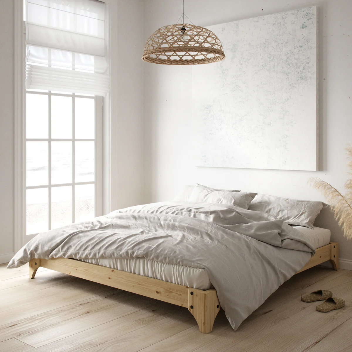 Das Elan Bett von Karup Design zeichnet sich durch seine schlichte, unaufdringliche Erscheinung aus. Gefertigt ist das Gestell aus Kiefernholz, dessen Maserung deutlich sichtbar ist und den natürlichen Charakter des Holzes wunderbar unterstreicht. Aufgebaut ist das Bett wie die klassisch japanischen Futon Betten. Es besteht aus einem gradlinigen Rahmen mit simplem Lattenrost. Aufgrund seines schlichten Designs lässt sich das Bett in jedes Ambiente integrieren und nach Belieben mit Kissen und Decken in Szene setzen. Verantwortlich für den Entwurf des Elan Bettes ist das Designerduo Steffensen & Würtz.