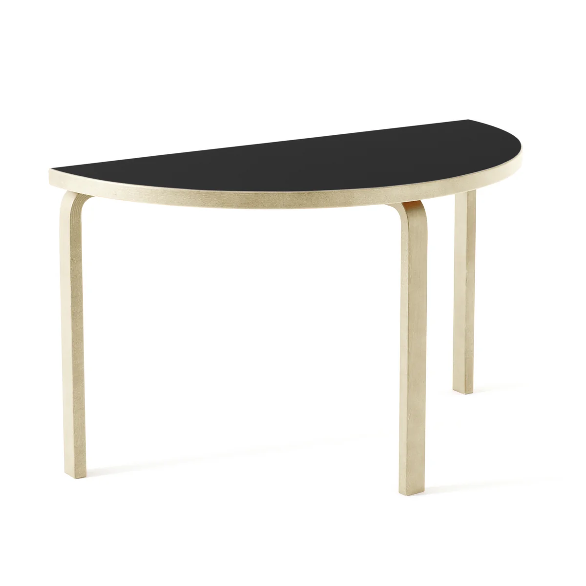Der Tisch mit einer Halbkreisplatte wird aus Birkenholz hergestellt und ist in verschiedenen Lackierungen erhältlich.