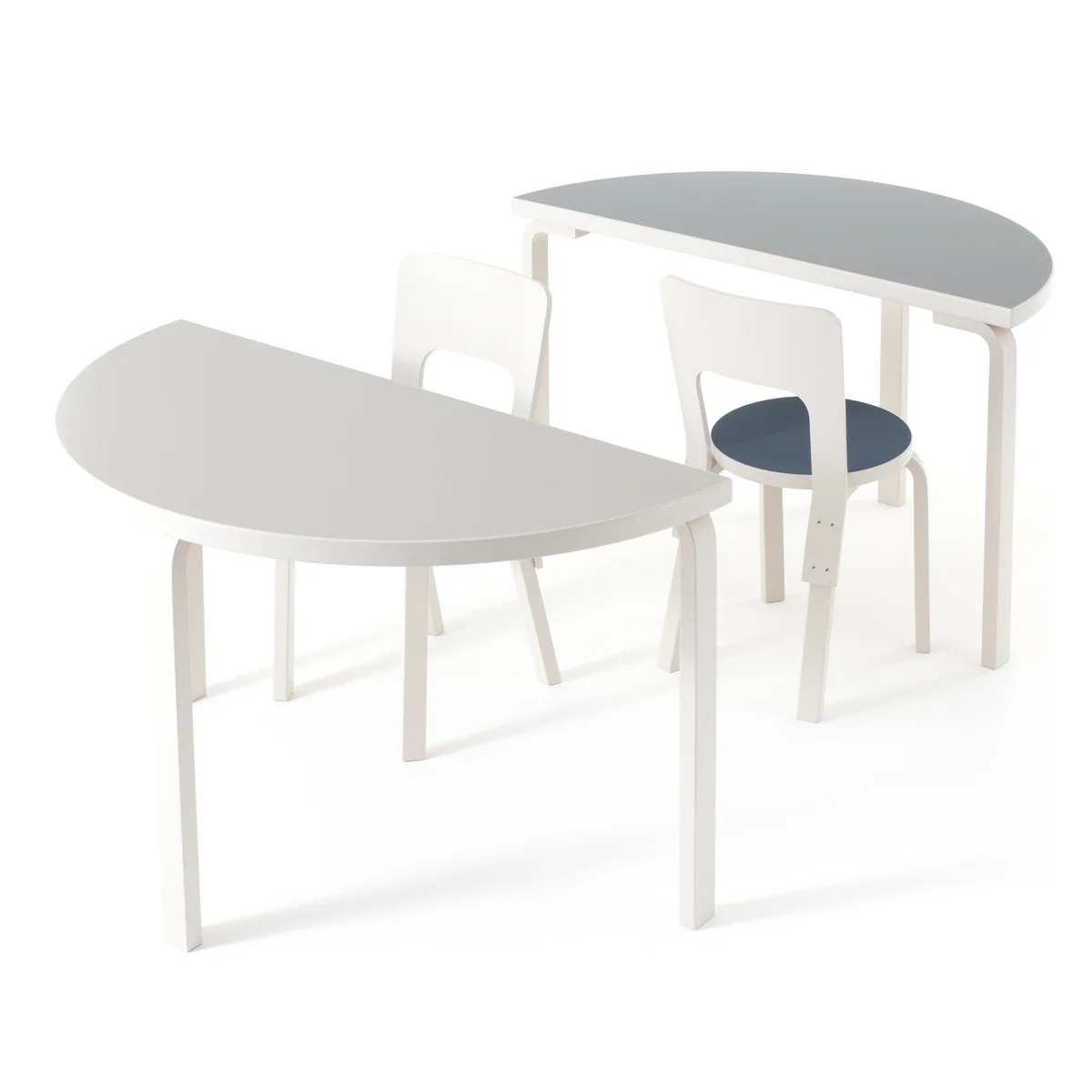 Das Besondere an dem Artek-Tisch sind die halbkreisförmige Tischplatte und die L-förmigen Tischbeine, die den sonst so schlichten Tisch zum Hingucker werden lassen. Gleichzeitig ist die Form auch besonders für kleinere Wohnung interessant, in die kein grosser Esstisch passen würde. So lässt sich der halbrunde Tisch einfach an eine Wand stellen, wo er Platz für zwei Stühle bietet.