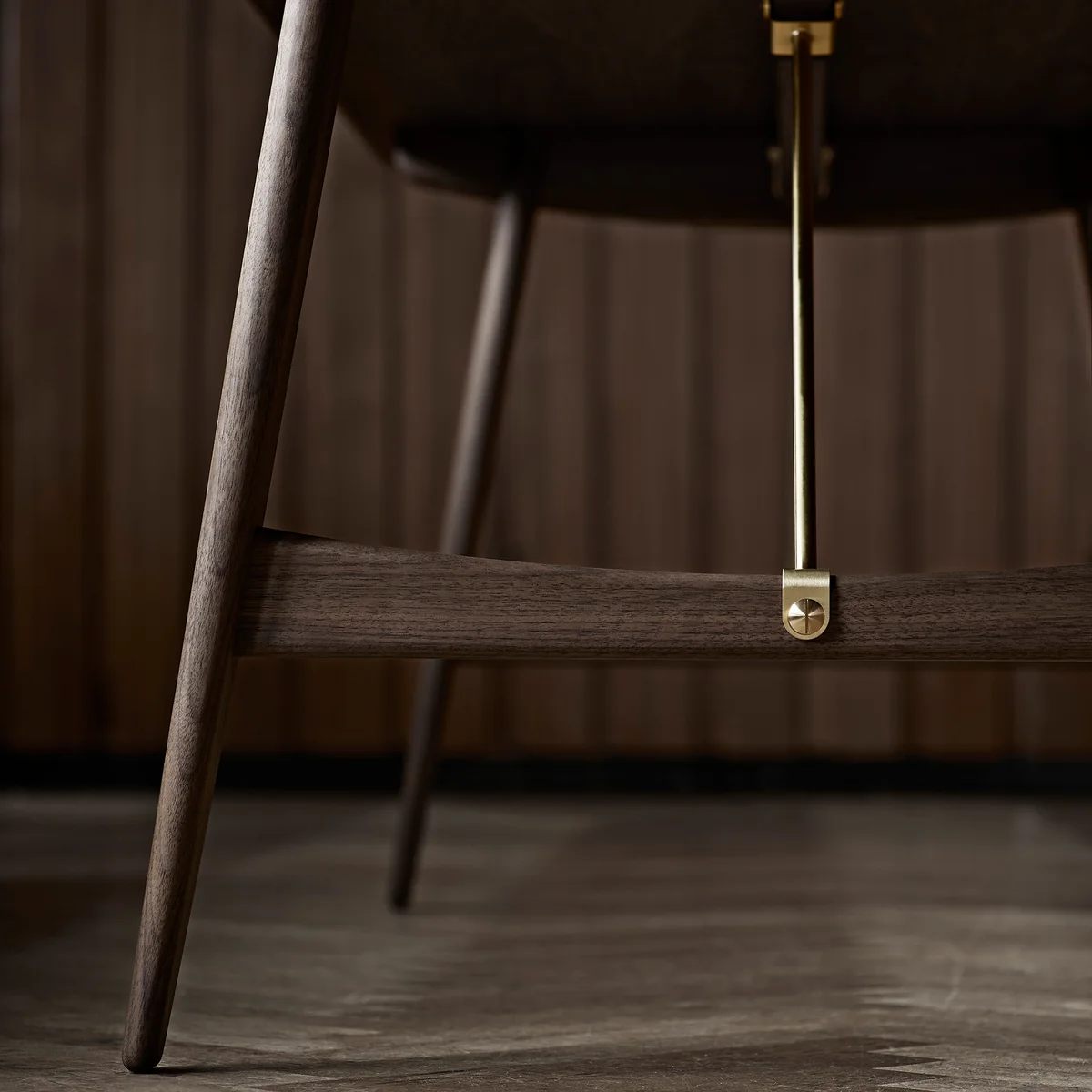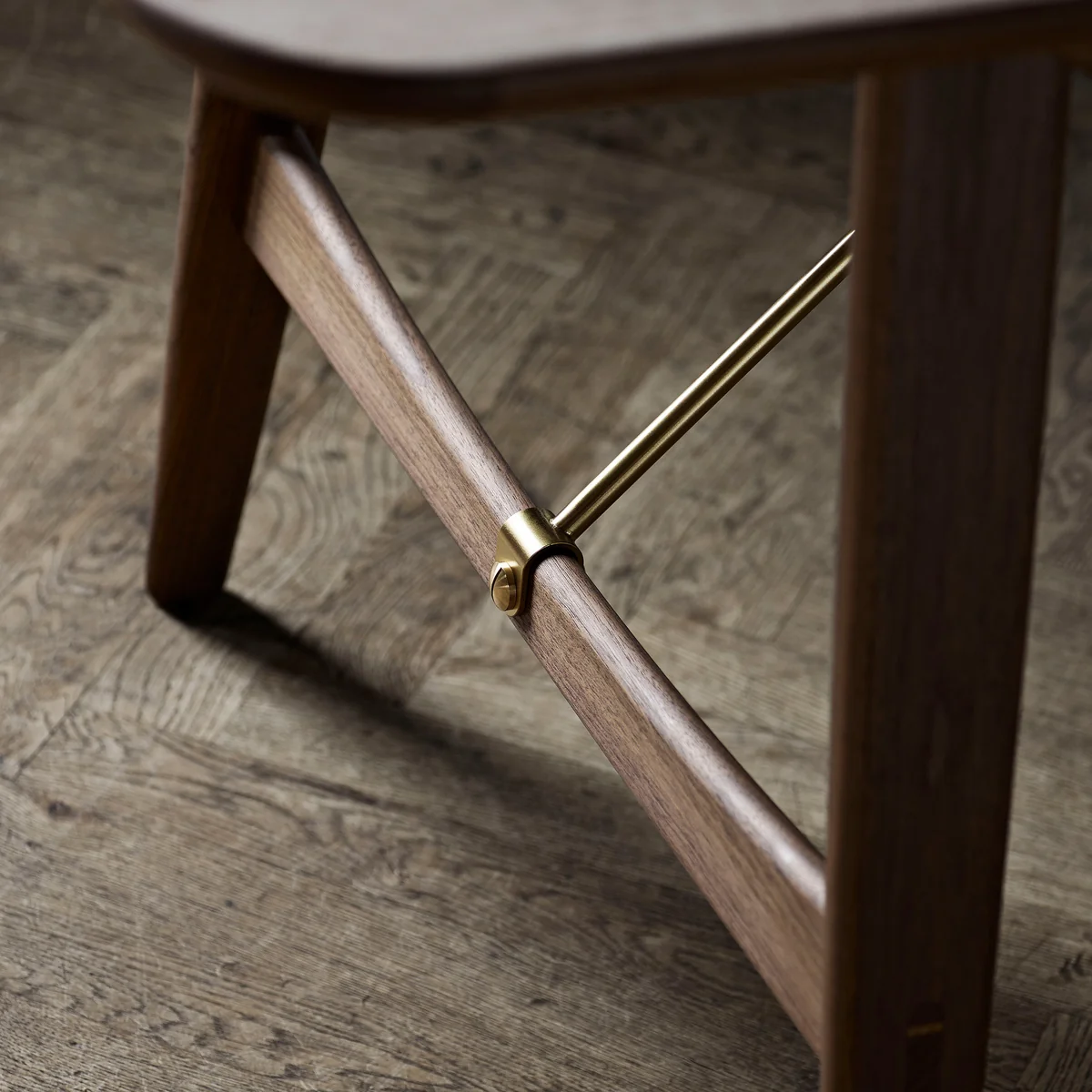 Gefertigt ist der Tisch aus massivem Holz, dessen Maserung deutlich sichtbar ist und daher für eine natürliche Note im Ambiente sorgt. Die abgerundeten Kanten und konisch zulaufenden Beine mit weichen Konturen verstärken diesen organischen Look. Einen Kontrast schaffen die Diagonalstreben aus Metall, die ein industrielles Element einbringen und damit für eine spannende Komposition sorgen.