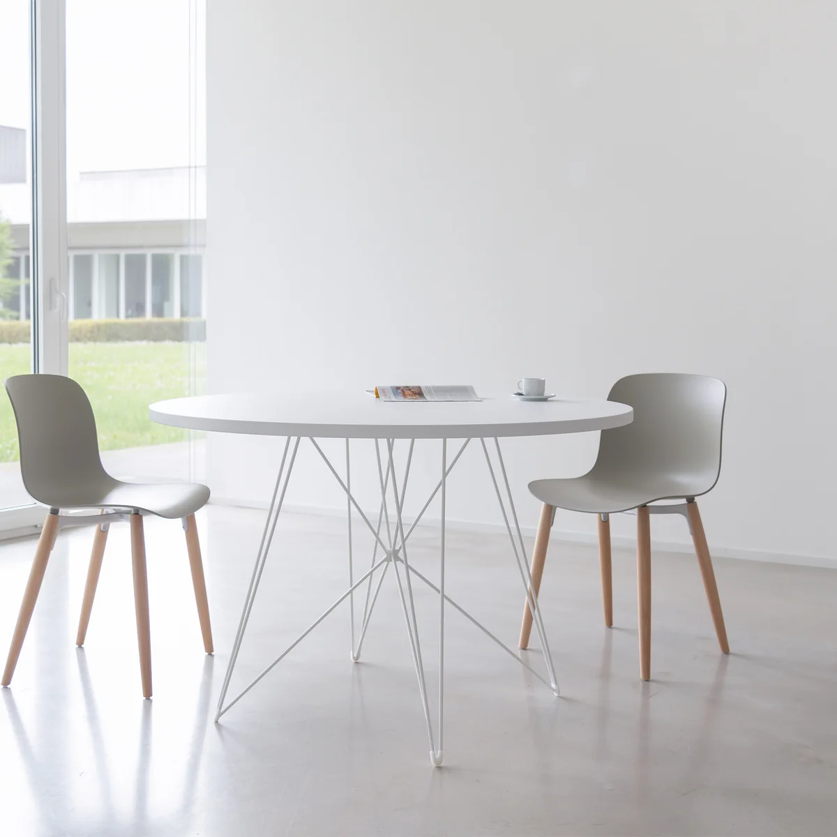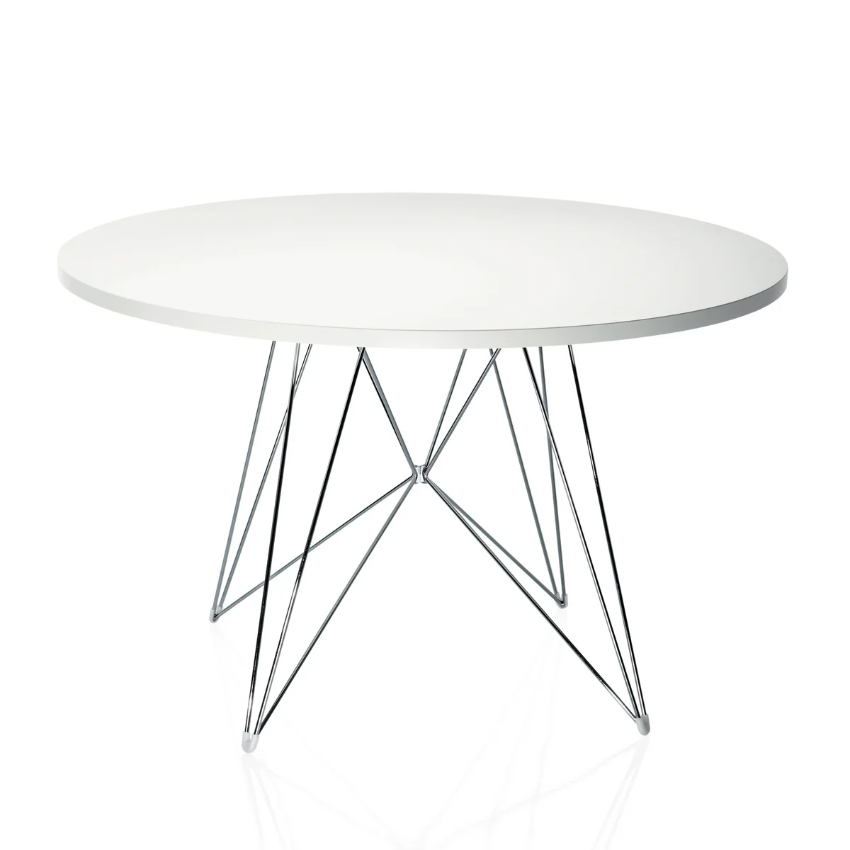 Das grazile Stahldraht-Tischgestell ist - passend zu den Tischplatten - in einer verchromten Variante oder epoxydlackiert in Schwarz oder Weiss erhältlich. Damit gliedert sich Tavolo (ital. Tisch) mühelos in die verschiedensten Einrichtungsstile ein. Der Tavolo XZ3 Esstisch von Magis ist auch in einer rechteckigen Variante mit Schwarzer oder Weisser Tischplatte erhältlich.