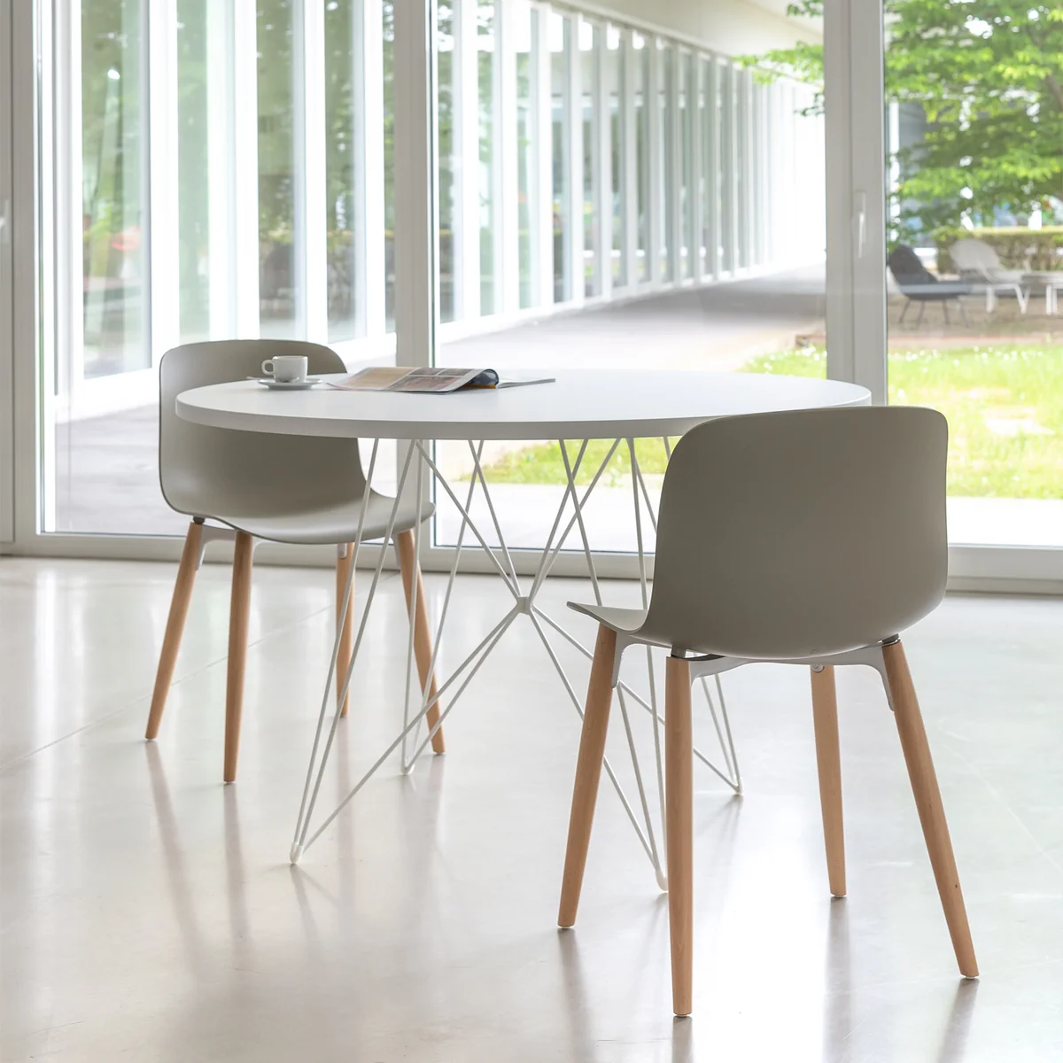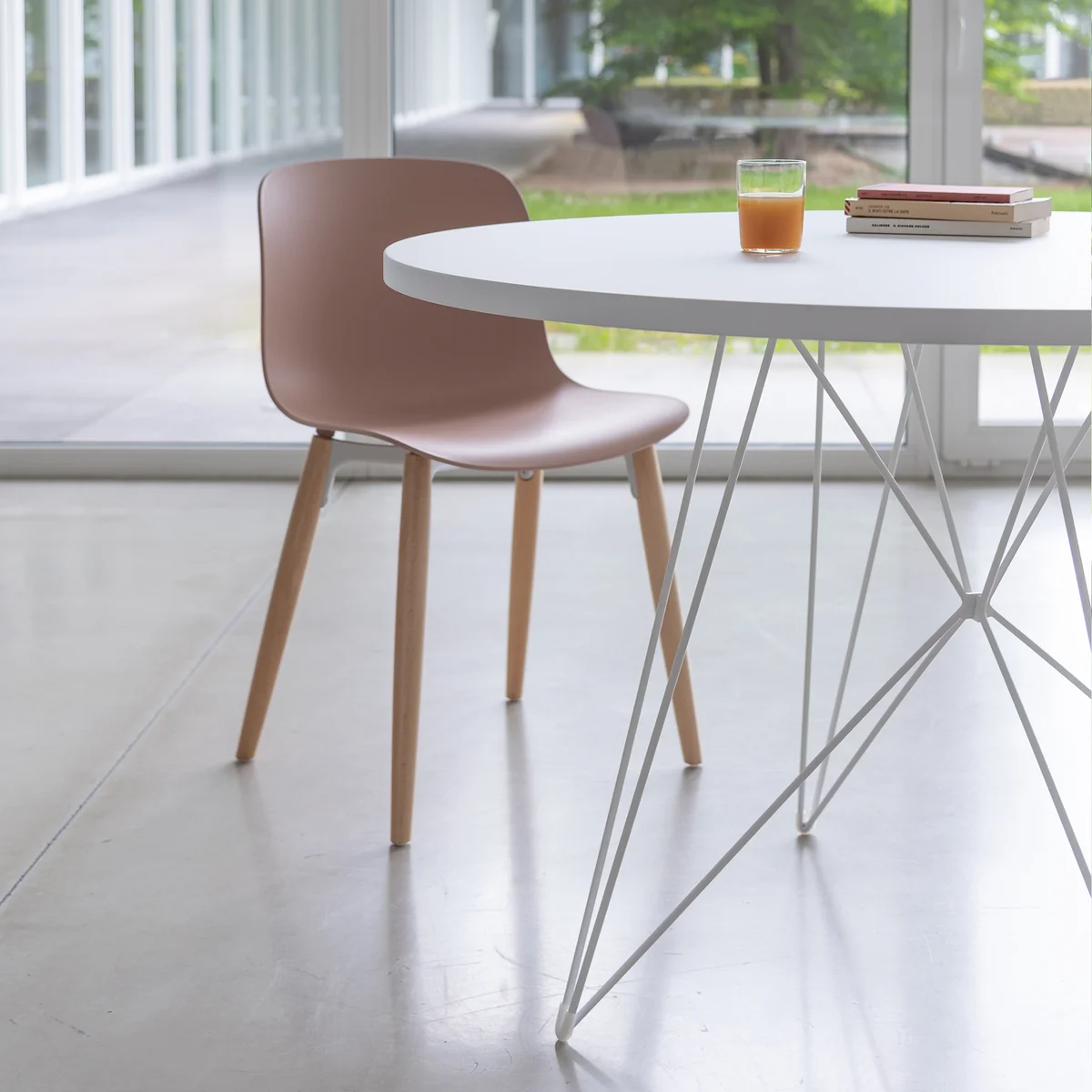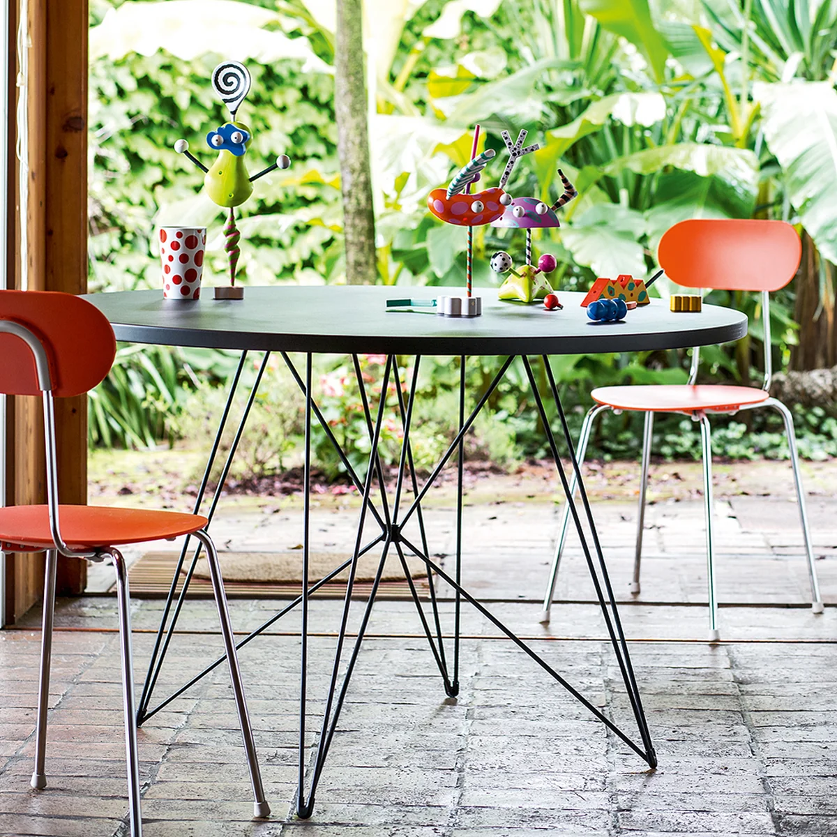 Der Esstisch Tavolo von Magis präsentiert sich mit einem filigranen Stahldraht-Gestell und einer runden Tischplatte aus strapazierfähigen MDF. Das Magis Design aus dem Jahr 1990 bietet mit seiner runden Tischplatte, die einen Durchmesser von 120 cm misst, Platz für die ganze Familie. Das besonders ausgefallene Tischgestell macht Tavolo zu einem individuellen Tisch für den Essbereich.