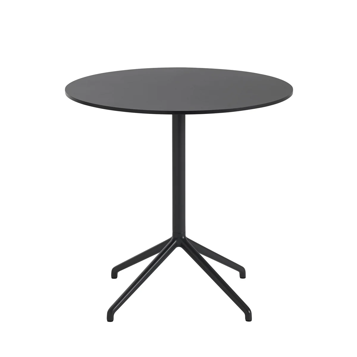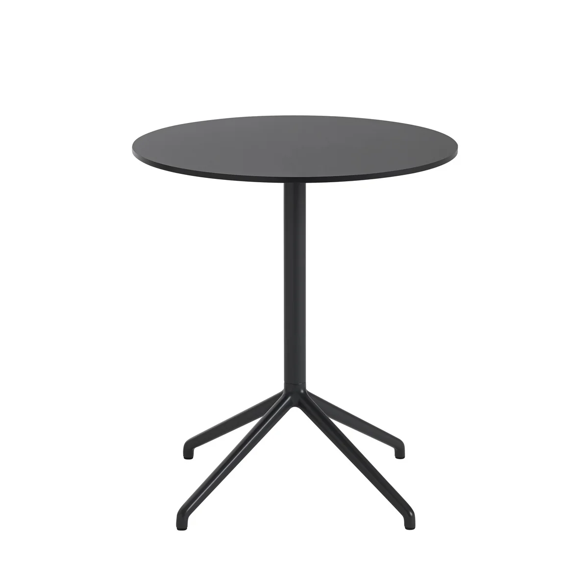 Die runde, laminierte Tischplatte thront auf einem Sockel aus pulverbeschichtetem Stahl. Die Basis bildet ein vierbeiniger Fuss mit angewinkelten Kanten. Die Kombination aus runden Formen und definierten Linien macht den Still Café Tisch zu einem stilvollen Möbelstück passend für jedes Ambiente.