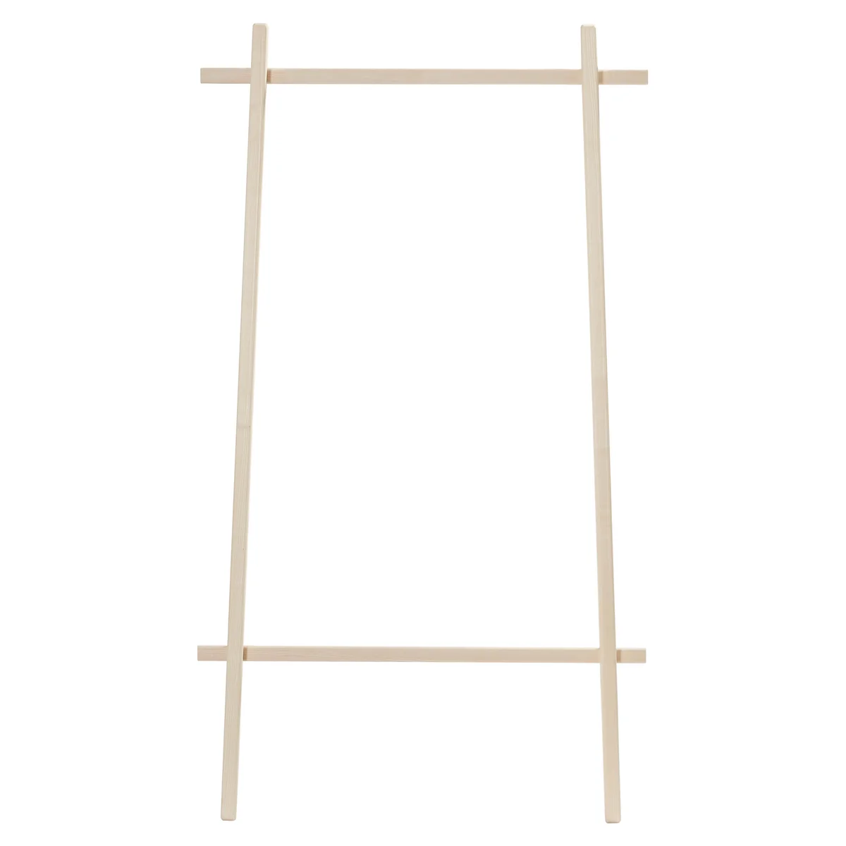Der Kleiderständer besteht aus zwei Holzstangen, die durch zwei Querstreben zu einer stabilen Konstruktion werden. Diese Konstruktion wiederrum wird an der Wand folgendermassen installiert: Eine Halterung wird auf Höhe der Oberkante der Garderobenkonstruktion an der Wand befestigt. Zwei Gummibänder sind mit der Halterung verbunden, die nun um die Holzstangen der Garderobe gewickelt werden. Der Holzrahmen wird nun sicher von der Konstruktion mit den Gummibändern an der Wand gehalten und stabilisiert sich selbst mit seinen Füssen, die gegen die Wand drücken und keinen Platz im Raum verschwenden. An der Garderobe finden nun Kleiderbügel und Haken Platz. Zusätzlich können Gegenstände an den abstehenden Seiten der oberen Querstange gehängt werden.