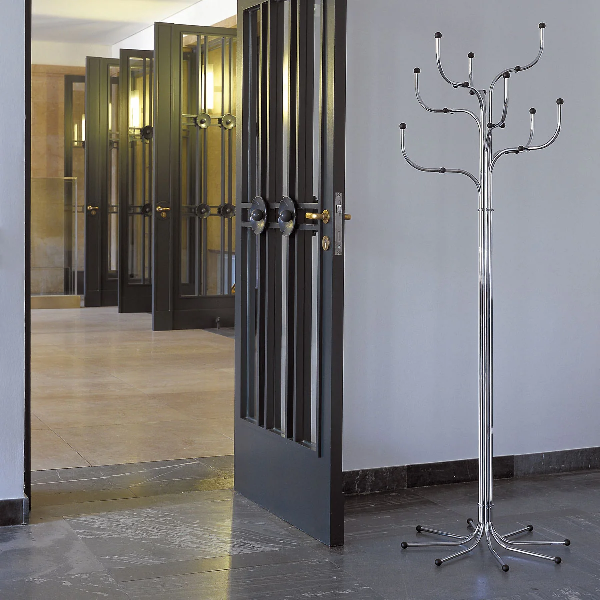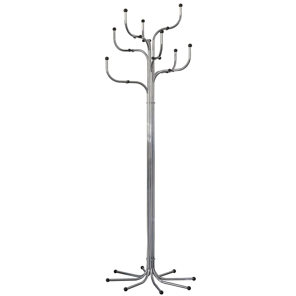 Der Garderobenständer Coat Tree ist in verchromtem Stahl mit schwarzen Kunststoffkugeln und in drei lackierten Ausführungen erhältlich: Mehrfarbig, Grautöne oder weiss mit jeweils passenden Kunststoffkugeln.