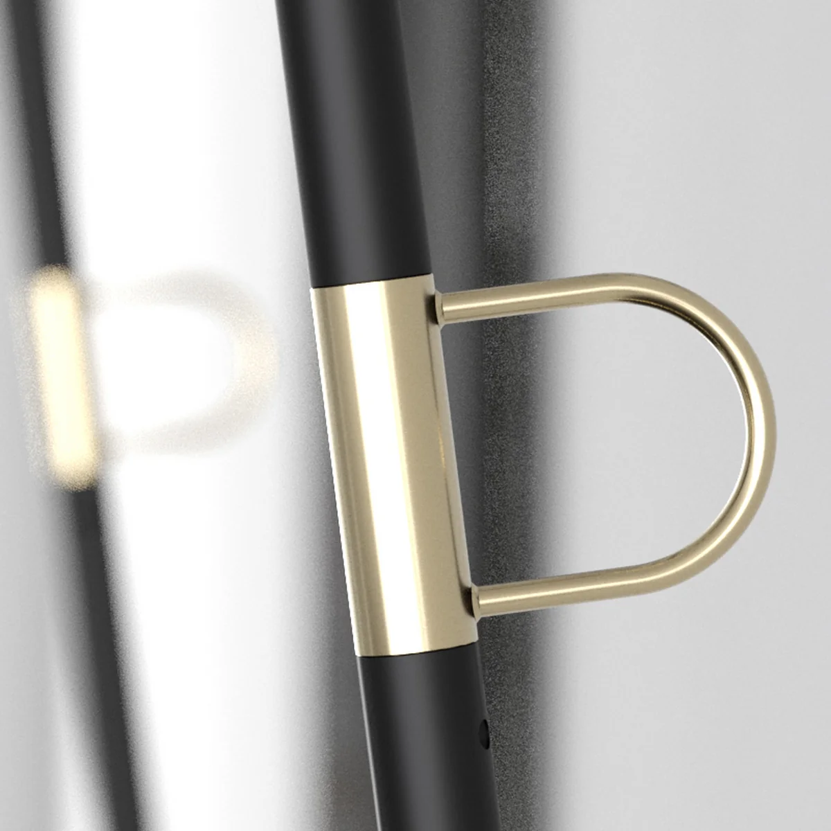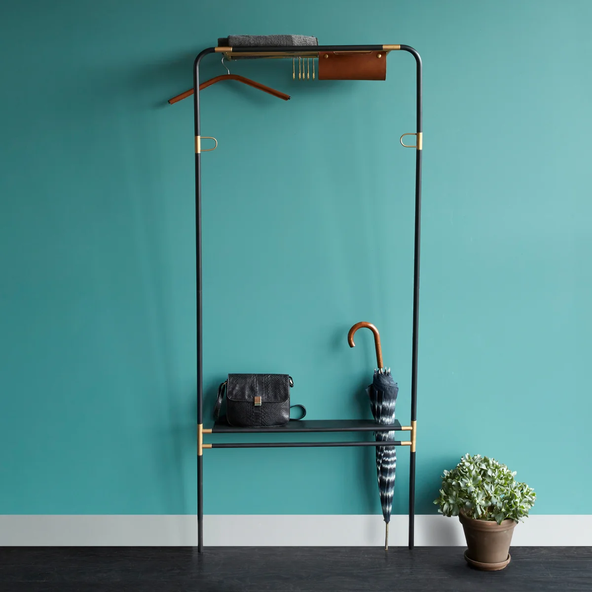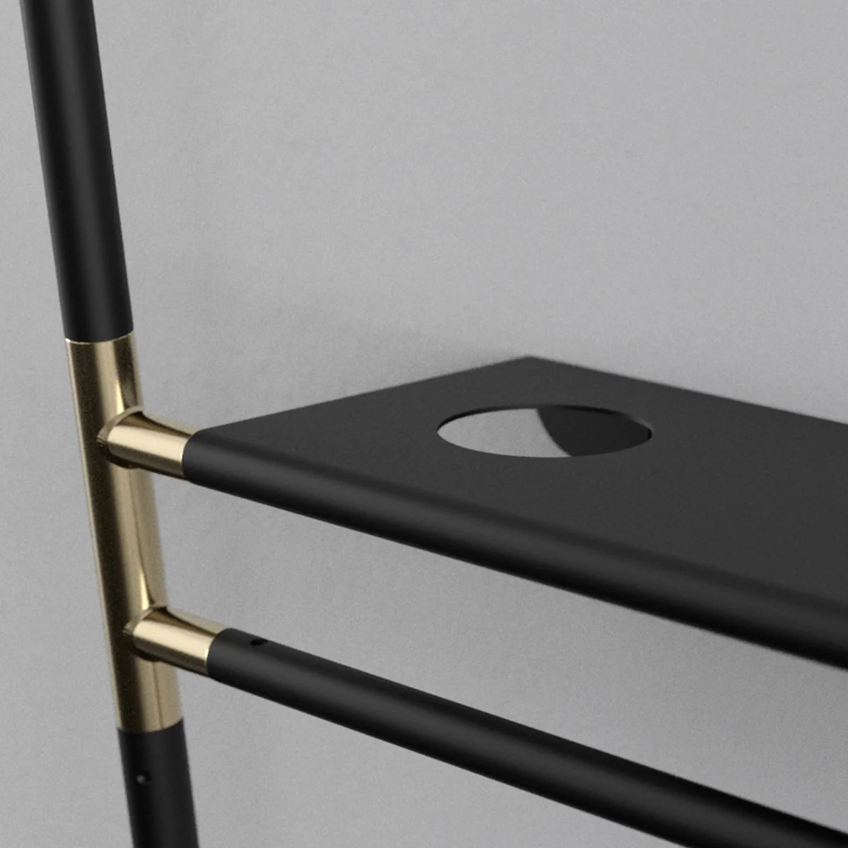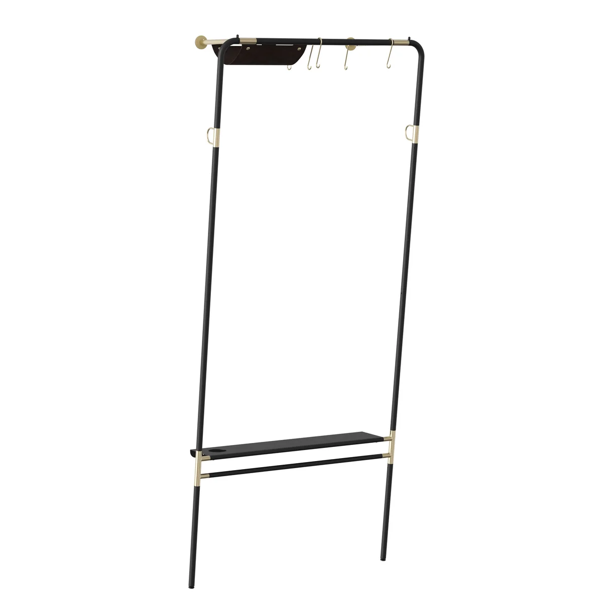 Pulverbeschichteter Stahl verleiht dem von Jonas Søndergaard entworfenen Kleiderständer einen leichten Industriestil, unterbrochen von warmen Messing-Details.