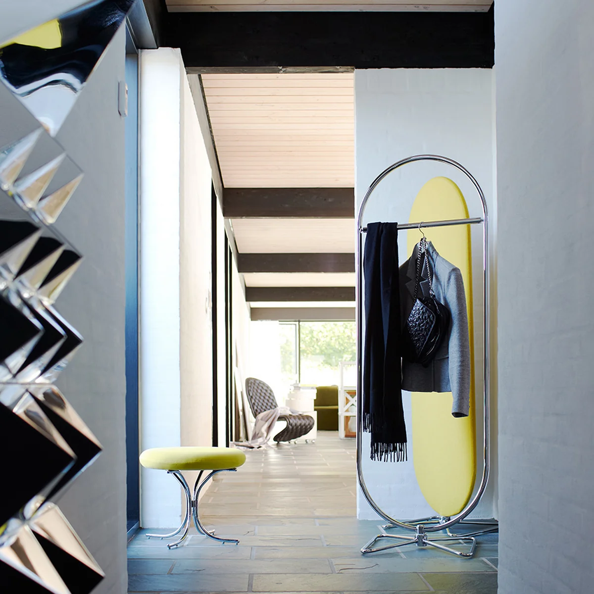 Der für seine extravaganten Entwürfe bekannte Erfolgsdesigner Verner Panton gestaltet im Jahr 1973 den System 1-2-3 Garderobenständer, der dem Designanspruch des Dänen voll und ganz entspricht. Die ovale Konstruktion mit geschwungener Silhouette verbreitet eine federleichte Note in jedem Ambiente, die durch den eleganten Fuss in Schmetterlingsform zusätzlich ergänzt wird.