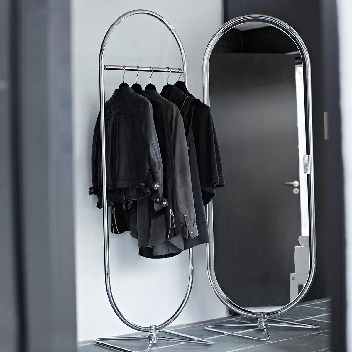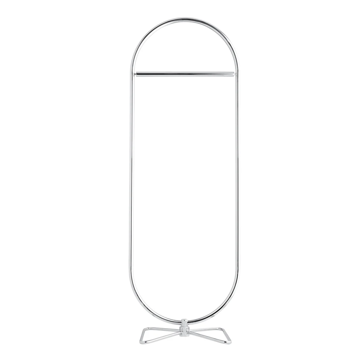 Der glänzend verchromte Rahmen ist mit einer horizontal verlaufenden Kleiderstange im Inneren des Ovals versehen, an der Kleiderbügel stilvoll ihren Platz finden.