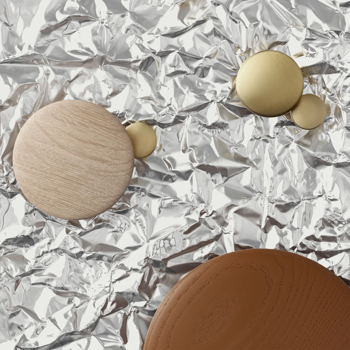 Im Gegensatz zu den ursprünglichen Dots aus Holz werden die Dots Metal aus Aluminium, Messing oder Edelstahl hergestellt. Die Erinnerung an einen Türknauf oder einen Schubladengriff ist der Formgebung der Dots geschuldet.
