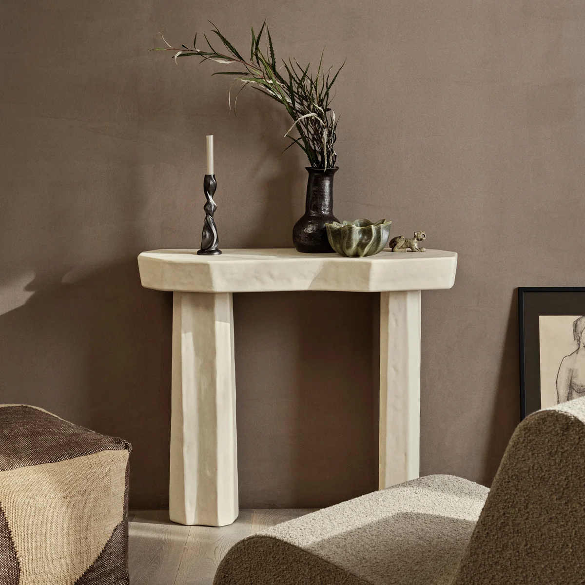 Mit seiner kompakten Grösse eignet sich der Staffa Konsolentisch perfekt als schmaler Beistelltisch im Flur, als Ablage im Wohnzimmer oder als stilvolle Ergänzung im Schlafzimmer. Seine Vielseitigkeit macht ihn zu einem echten Allrounder.