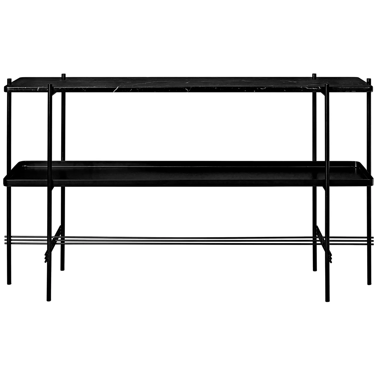 Der TS Konsolentisch von Gubi besteht aus einer Tischplatte aus Marmor und einem Gestell aus schwarzem Stahl.