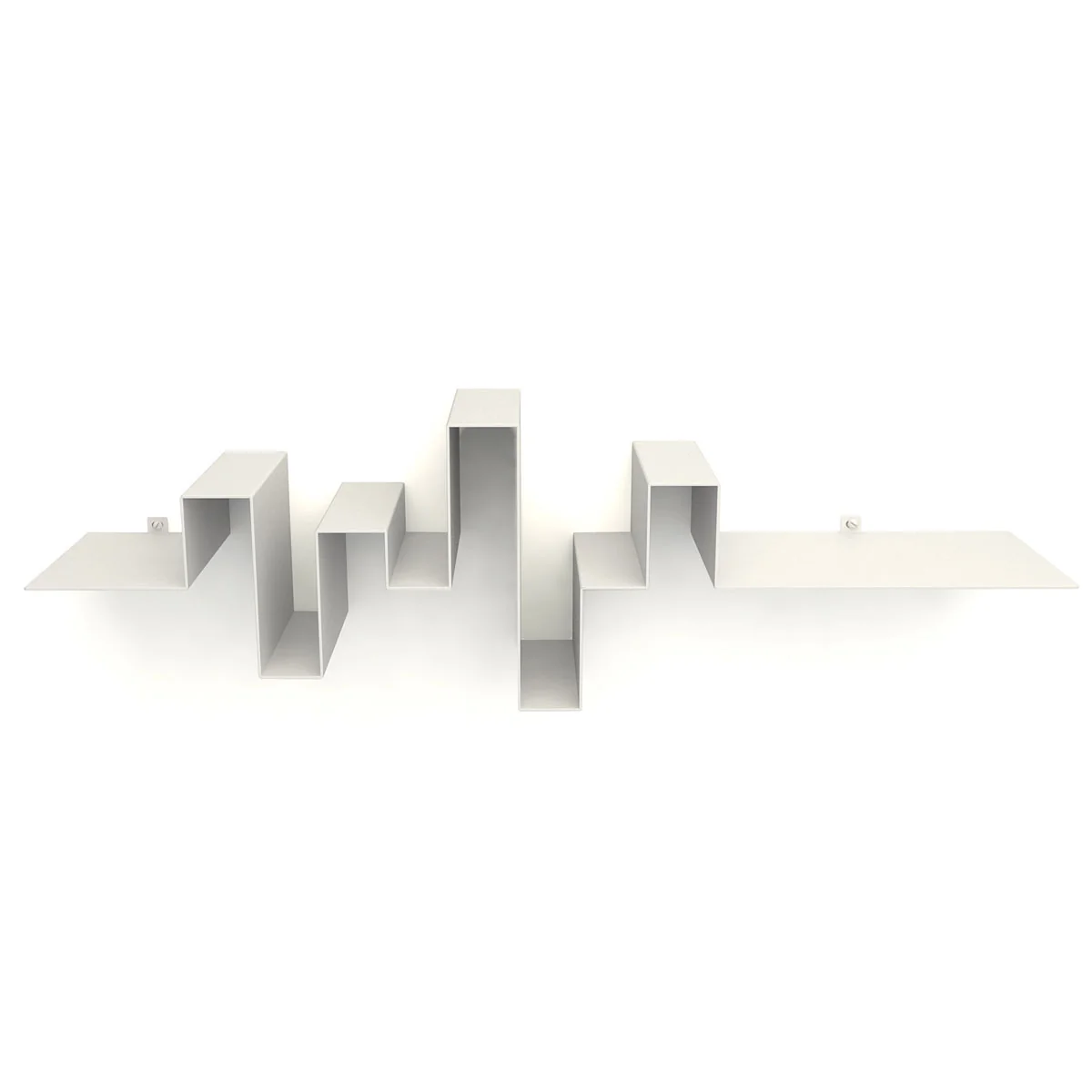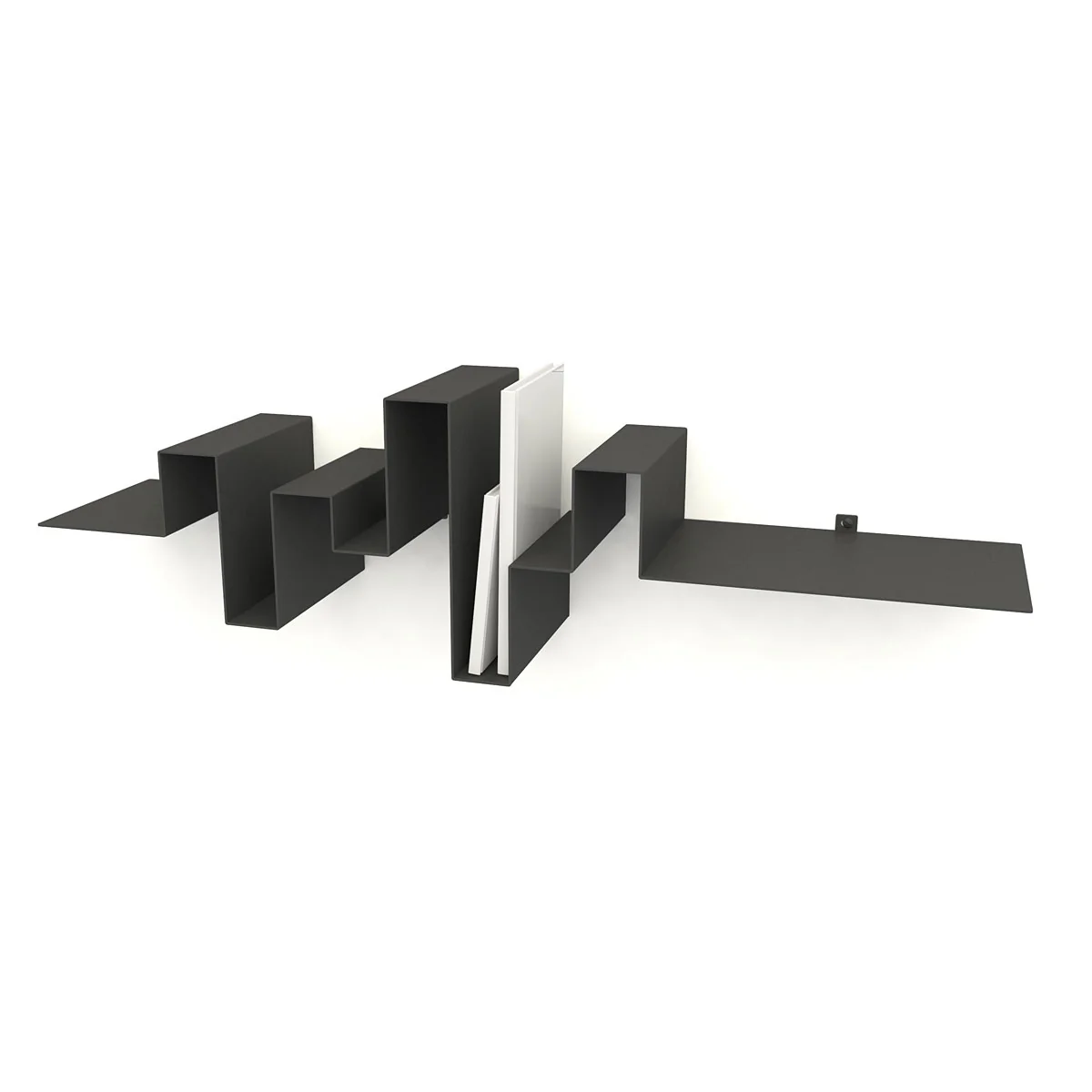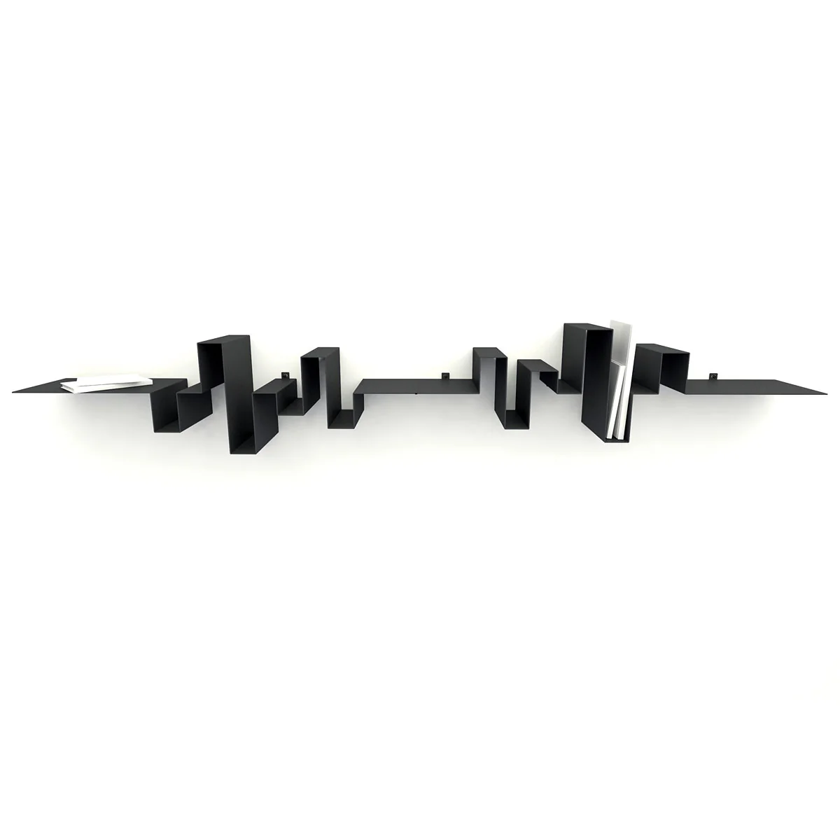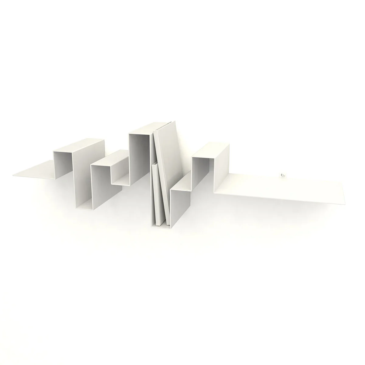 Die einzelnen Ebenen und "Kurvenverläufe" zusammengenommen bieten zahlreiche Möglichkeiten, Bücher, Bilder oder kleine Einrichtungsgegenstände abzulegen oder anzulehnen. Die einzelnen Segmente machen Buchstützen überflüssig.