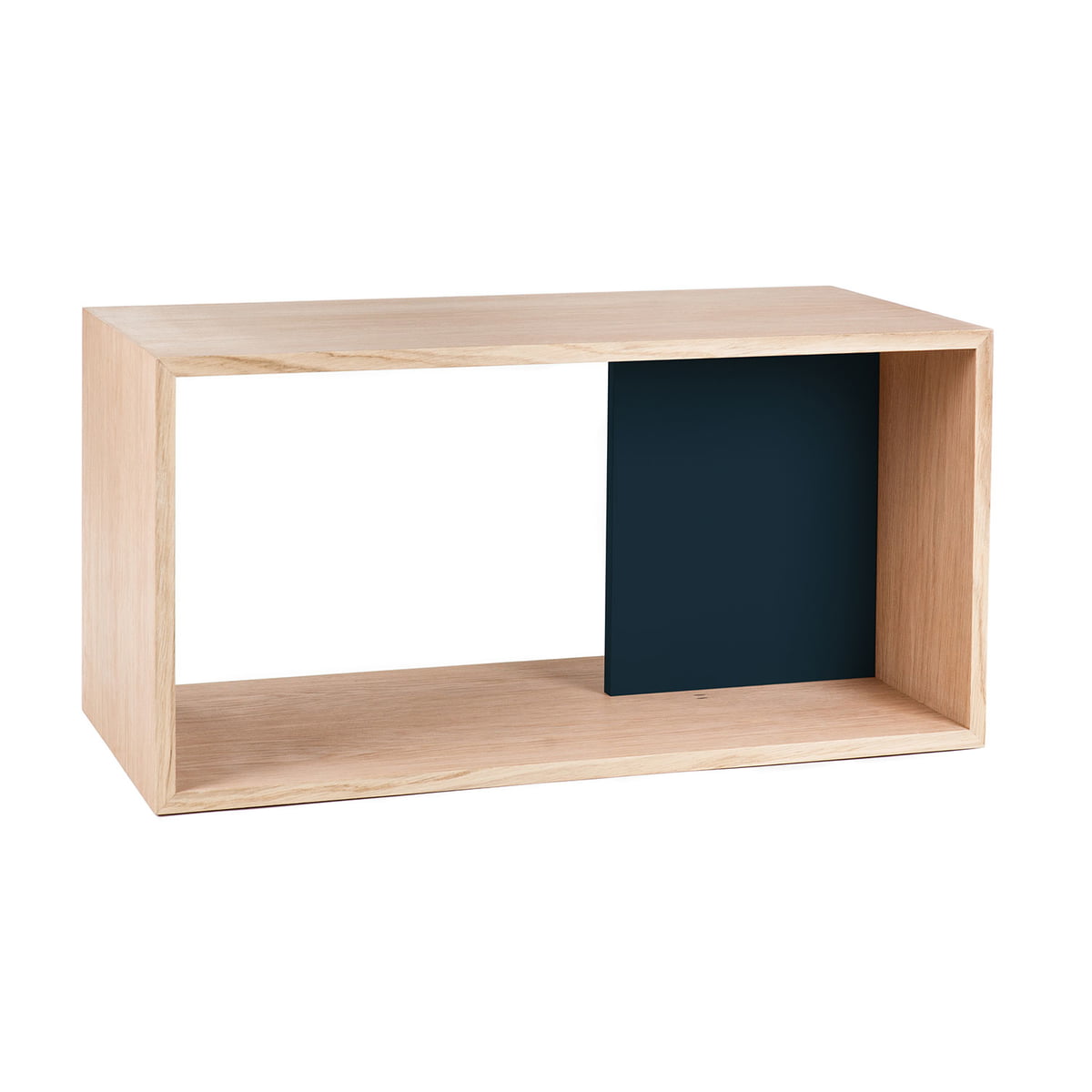 Die Basis des Regalsystems bildet eine Box aus MDF in Eiche furniert, die mit einer matt lackierten Innenplatte in verschiedenen Farben ausgestattet ist. Die Module können beliebig hochkant und quer durch ein einfaches Montagesystem miteinander verbunden werden. Die Module werden einfach mit Hilfe von Messingverbindungen ineinander gesteckt und können so schnell auch wieder abmontiert werden. Edgar kann durch das Stecksystem von der simplen Box zum Sideboard oder hohen Bücherregal werden und in wenigen Minuten wieder zur einzelnen Box schrumpfen.